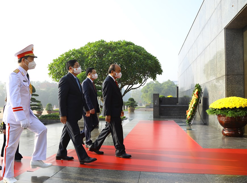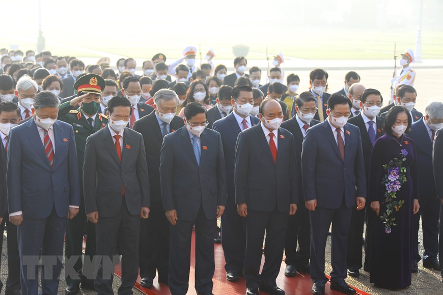Các lãnh đạo Đảng, Nhà nước, MTTQ Việt Nam cùng các đại biểu Quốc hội tham dự Kỳ họp thứ hai, Quốc hội khóa XV đặt vòng hoa và vào Lăng viếng Chủ tịch Hồ Chí Minh. (Ảnh: Nguyễn Điệp/TTXVN)