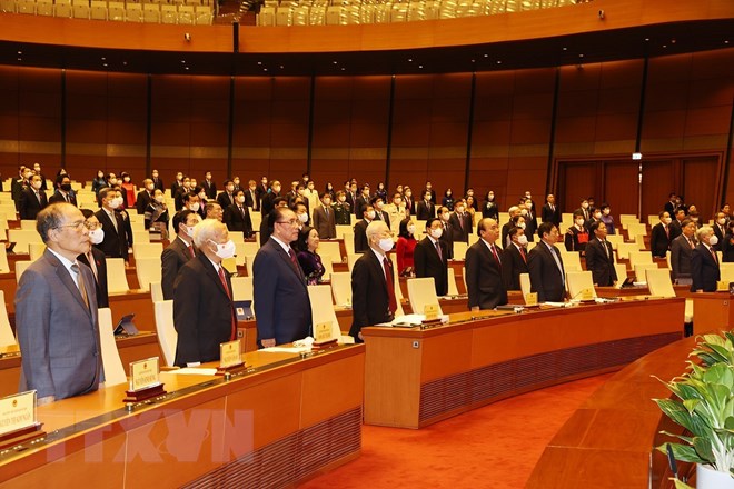 Các lãnh đạo, nguyên lãnh đạo Đảng, Nhà nước cùng các đại biểu Quốc hội thực hiện nghi lễ chào cờ khai mạc Kỳ họp thứ hai, Quốc hội khóa XV. (Ảnh: Trí Dũng/TTXVN)