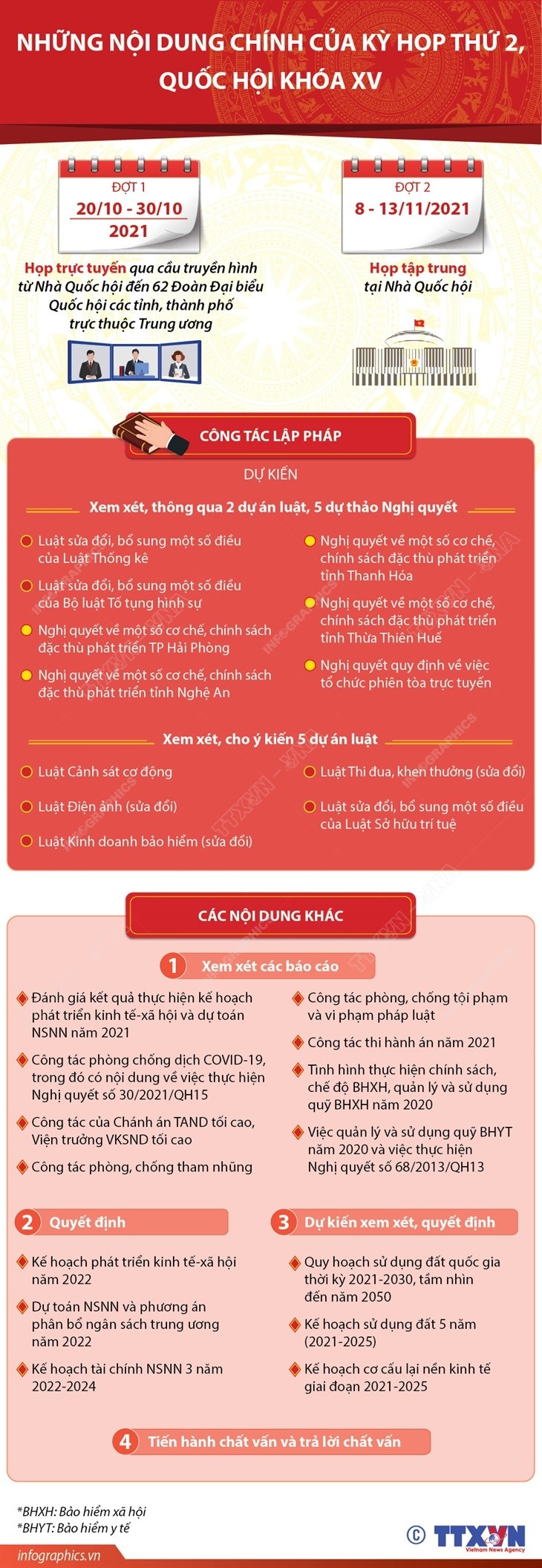 Kỳ họp thứ 2, Quốc hội sẽ xem xét, thông qua hai dự án luật và năm dự thảo Nghị quyết (theo quy trình tại một kỳ họp) gồm Luật sửa đổi, bổ sung một số điều của Luật Thống kê; Luật sửa đổi, bổ sung một số điều của Bộ luật Tố tụng Hình sự; Nghị quyết về một số cơ chế, chính sách đặc thù phát triển thành phố Hải Phòng; Nghị quyết về một số cơ chế, chính sách đặc thù phát triển tỉnh Nghệ An; Nghị quyết về một số cơ chế, chính sách đặc thù phát triển tỉnh Thanh Hóa; Nghị quyết về một số cơ chế, chính sách đặc thù phát triển tỉnh Thừa Thiên-Huế; Nghị quyết quy định về việc tổ chức phiên tòa trực tuyến.