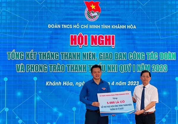 Đồng chí Nguyễn Tấn Tuân trao tặng Tỉnh đoàn Khánh Hòa 5.000 lá cờ Tổ quốc để thực hiện Công trình thanh niên “Đường cờ Tôi yêu Tổ quốc tôi”