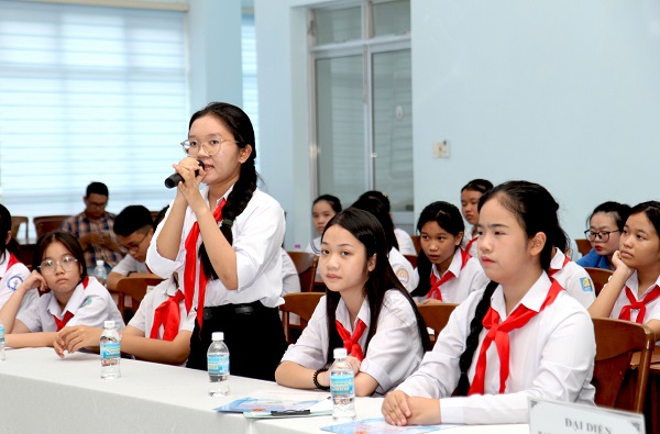 Đại biểu thiếu nhi phát biểu tại hội nghị.