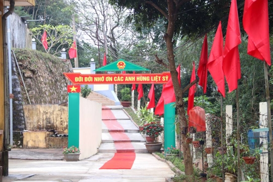 Đường dẫn lên Nhà bia tưởng niệm liệt sỹ được trang trí rực rỡ cờ hoa. Ảnh: Thanh Thuận |