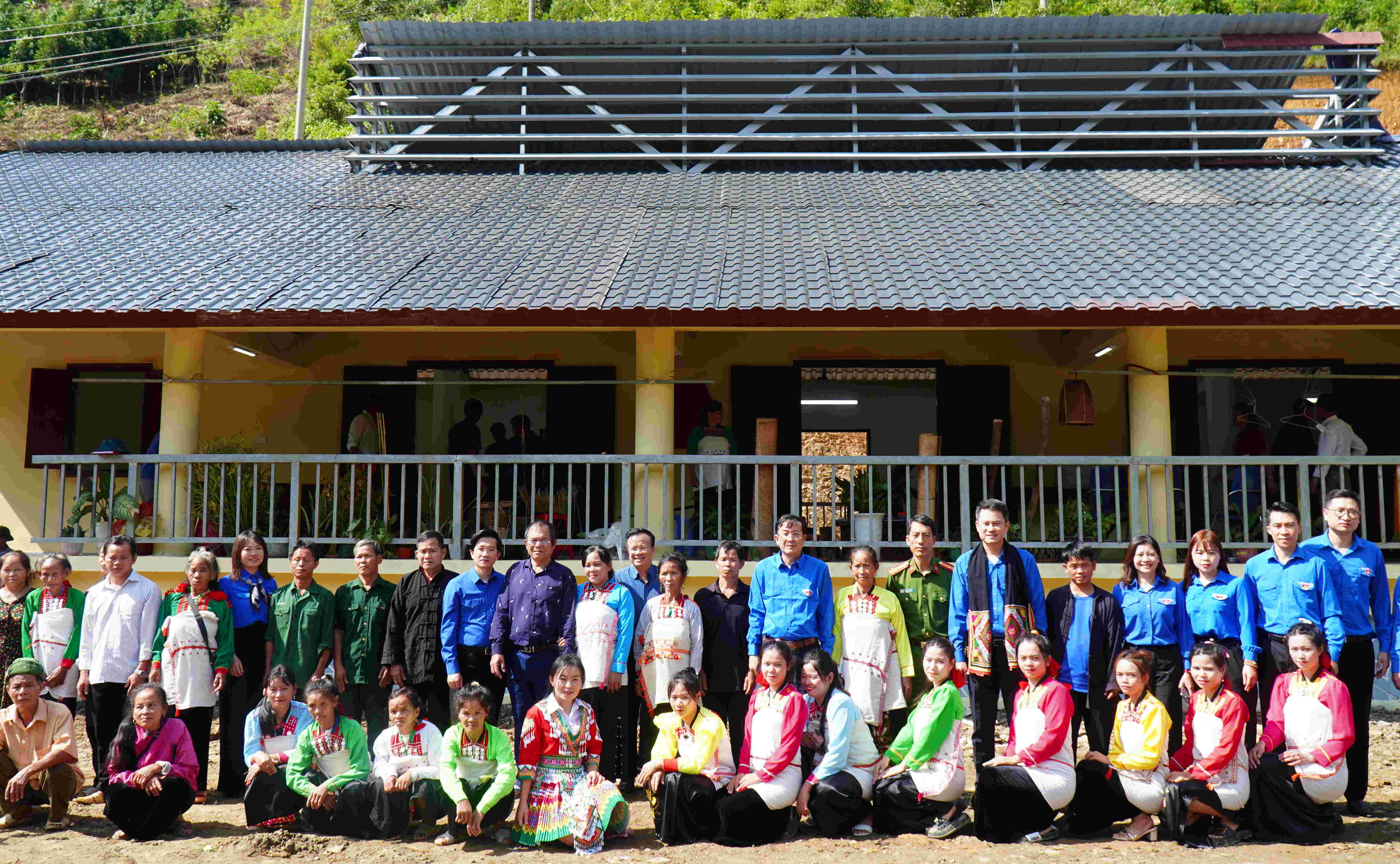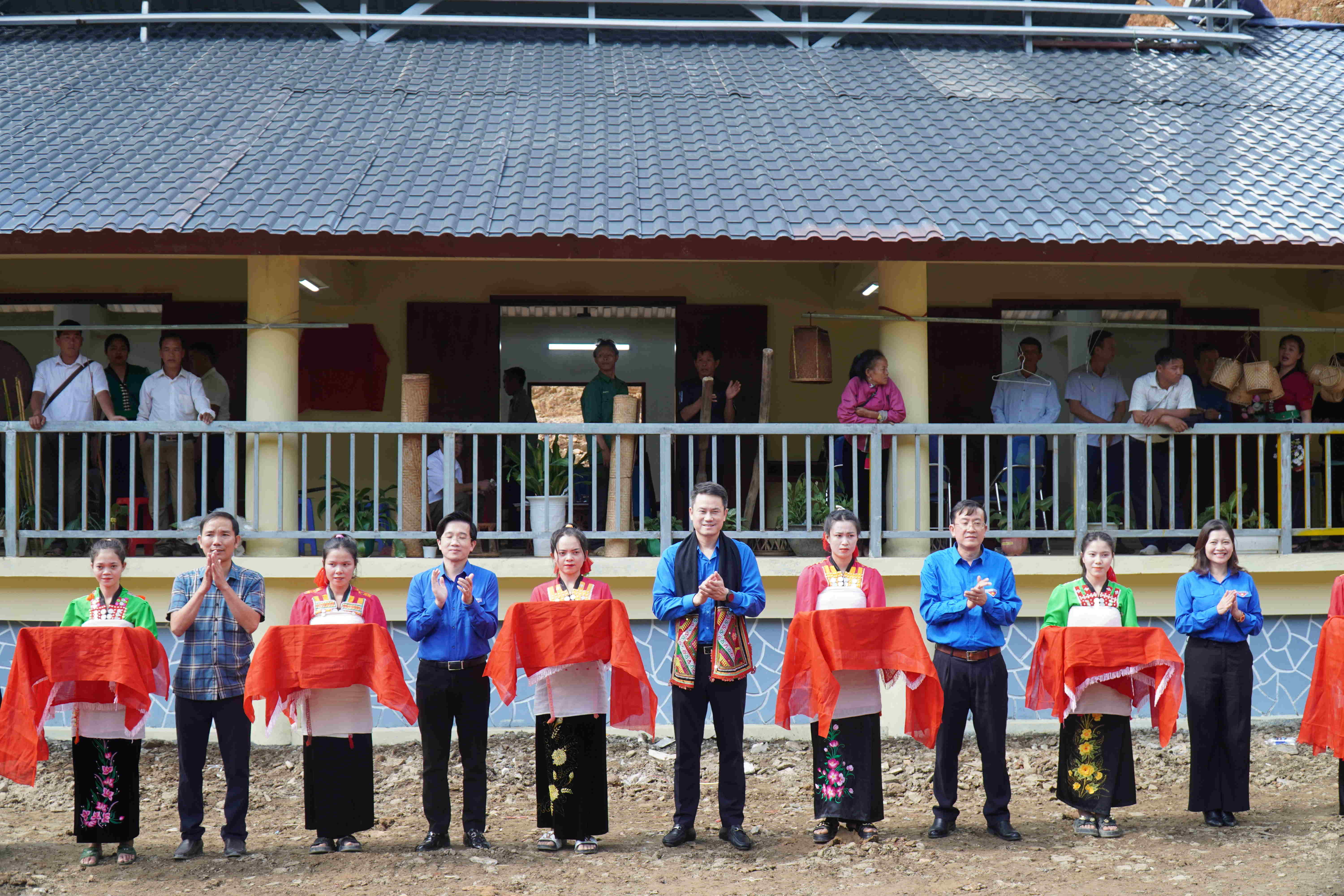 Các đại biểu cắt băng khánh thành nhà văn hóa bản Pá Bon.