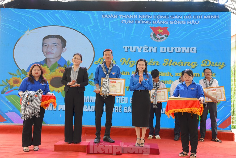 Đồng chí Nguyễn Phạm Duy Trang – Bí thư T.Ư Đoàn, Chủ tịch Hội đồng Đội T.Ư và đồng chí Võ Thị Thủy Tiên – Phó Trưởng Ban Dân vận Tỉnh ủy An Giang khen thưởng cho thanh niên sáng tạo cụm đồng bằng sông Hậu. Ảnh: Hoà Hội