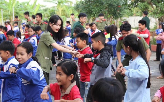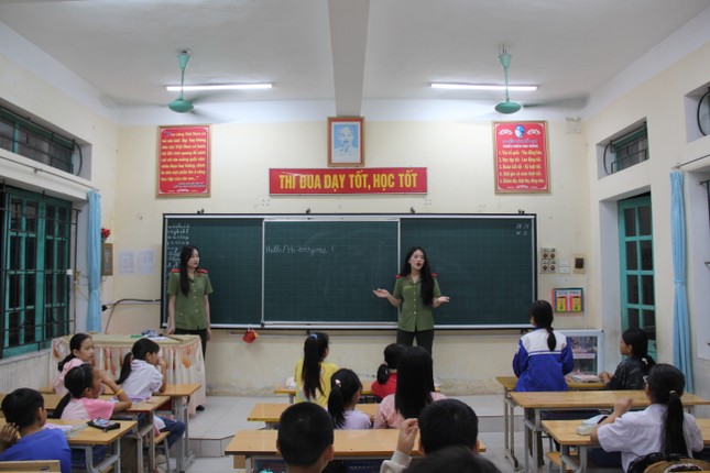 Những nữ học viên Học viện An ninh nhân dân phối hợp với cán bộ, giáo viên trường Tiểu học Quang Hưng hướng dẫn trẻ em học tiếng Anh