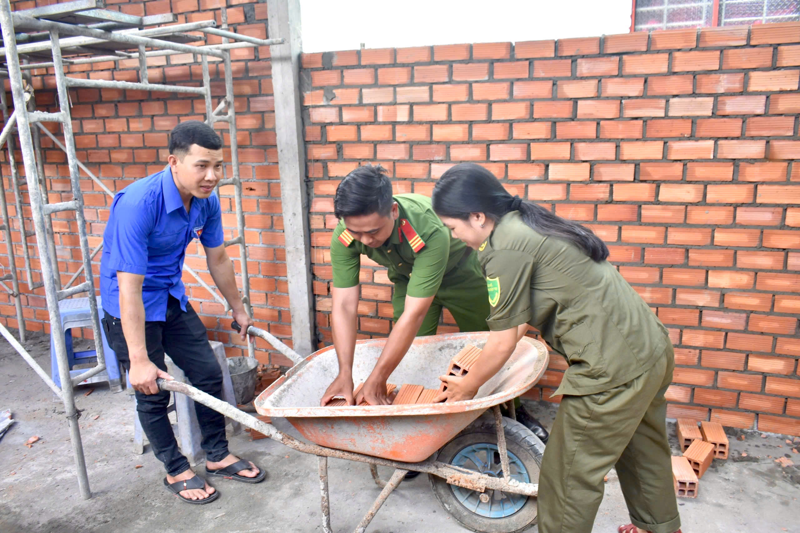 Dịp này, đội hình thanh niên tình nguyện ở địa phương đã tích cực hỗ trợ gia đình anh Nguyễn Ngọc Trung (cha của hai em Ngọc Bảo và Ngọc Trân) trong việc vận chuyển gạch, đá, vật liệu xây dựng, góp phần đẩy nhanh tiến độ thi công căn nhà.