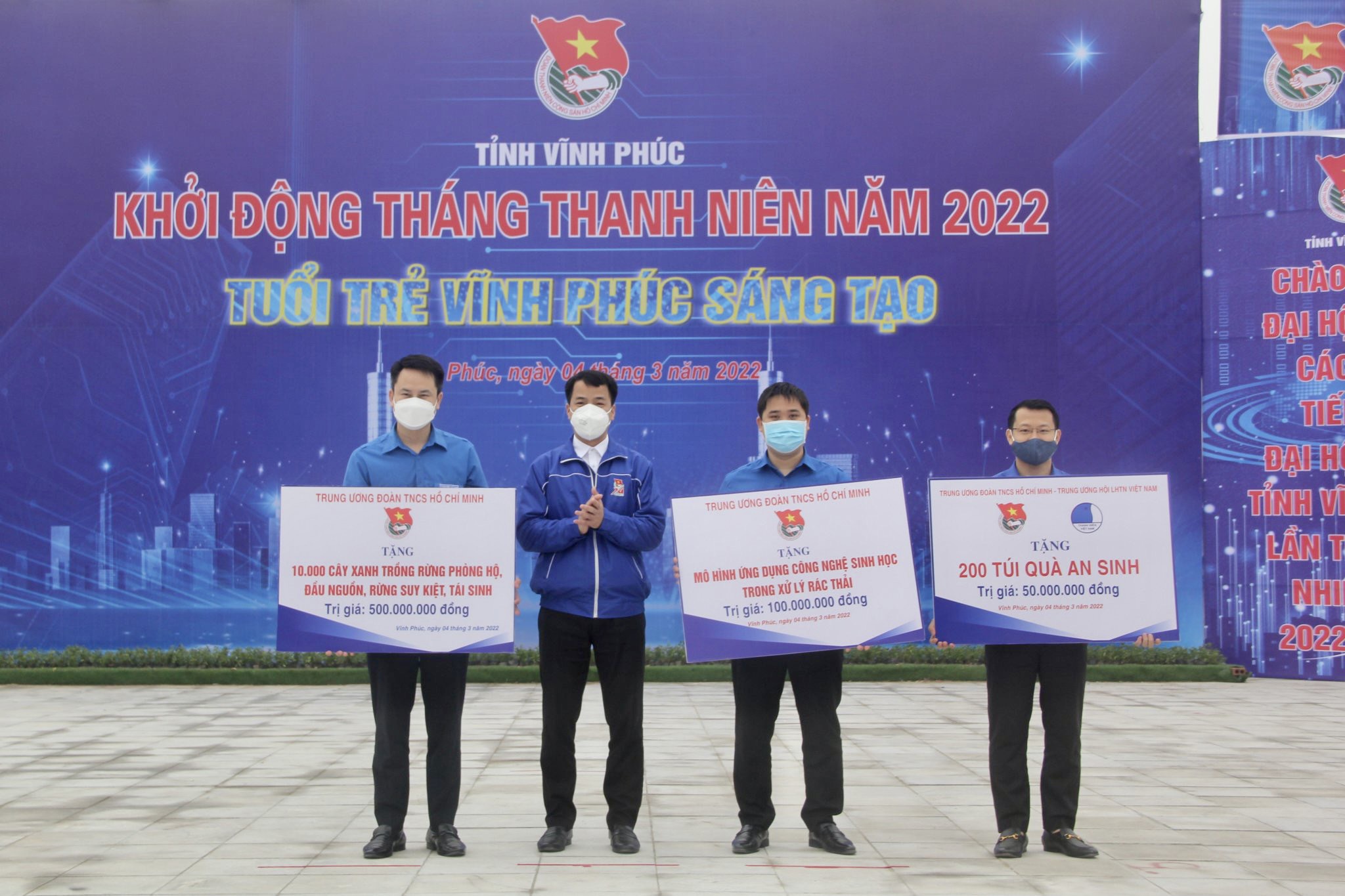 Cũng tại Chương trình, đồng chí Ngô Văn Cương - Bí thư TƯ Đoàn đã trao tặng Công trình thanh niên 10,000 cây xanh trồng rừng phòng hộ, đầu nguồn, rừng suy kiệt, tái sinh trị giá 500 triệu đồng cho Tỉnh đoàn Vĩnh Phúc; Trao tặng 01 mô hình ứng dụng công nghệ sinh học trong xử lý rác thải trị giá 100 triệu đồng; Trao tặng 200 “Túi an sinh” cho thanh thiếu nhi có hoàn cảnh khó khăn trong dịch covid-19 trị giá 50 triệu đồng.