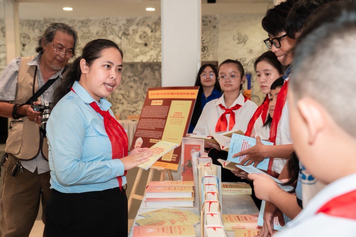 Đồng chí Trịnh Thị Hiền Trân - Phó Bí thư Thành Đoàn, Chủ tịch Hội đồng Đội TP. Hồ Chí Minh giới thiệu cho các em đội viên, học sinh về các tác phẩm của đồng chí Tổng Bí thư Nguyễn Phú Trọng.