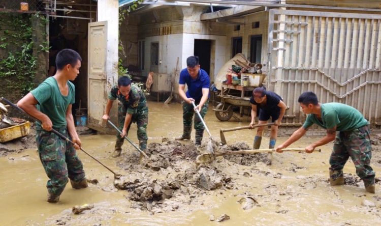 Cán bộ, chiến sĩ Sư đoàn 316 tham gia thu dọn vệ sinh sau lũ tại TP. Yên Bái.