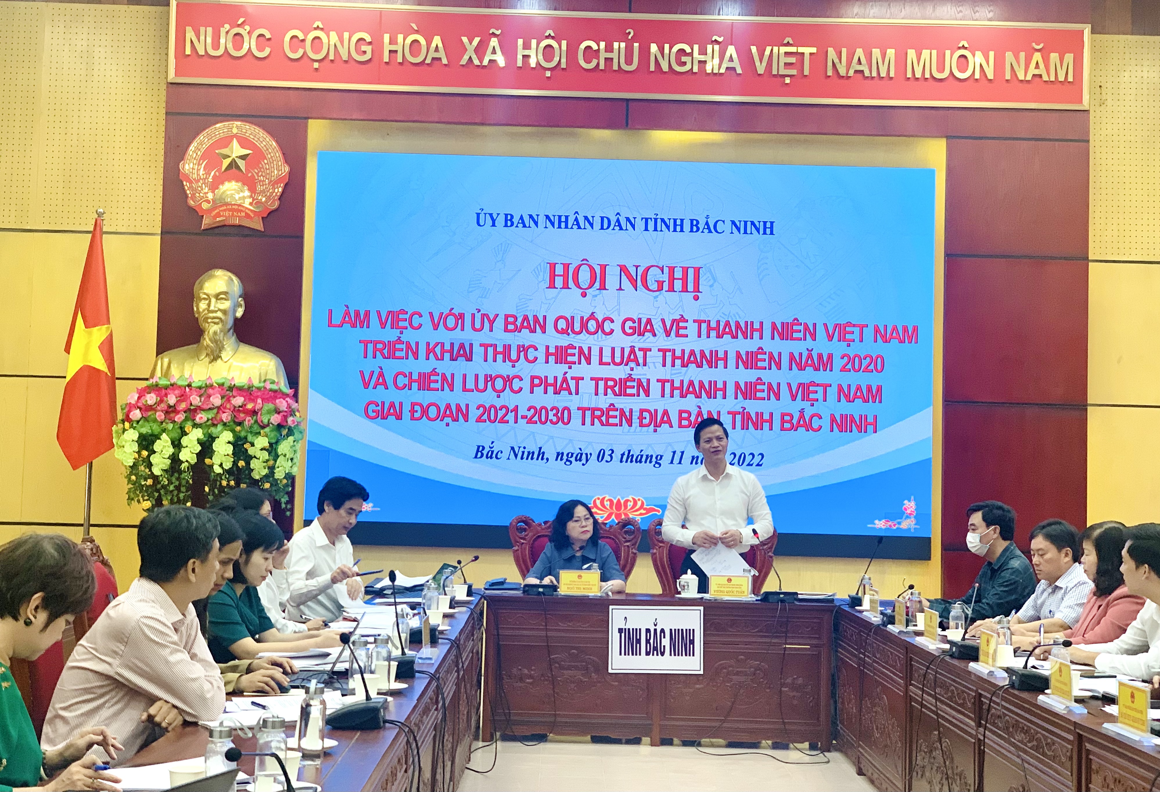 Tại buổi làm việc, đồng chí Vương Quốc Tuấn- Ủy viên Dự khuyết T.Ư Đảng, Phó Chủ tịch Thường trực UBND tỉnh Bắc Ninh đã trao đổi những vấn đề đặt ra trong việc triển khai thực hiện Luật Thanh niên năm 2020 và Chiến lược phát triển thanh niên Việt Nam giai đoạn 2021- 2030 của tỉnh. Đồng chí Vương Quốc Tuấn cho biết, thời gian qua, các cấp ủy Đảng, chính quyền tỉnh Bắc Ninh luôn quan tâm thực hiện các chính sách hỗ trợ thanh niên. Đồng thời, có nhiều đề xuất, kiến nghị đối với các cấp có thẩm quyền nhằm thực hiện tốt hơn nữa các chủ trương của Đảng, chính sách pháp luật của Nhà nước về chăm lo, giáo dục thanh niên.