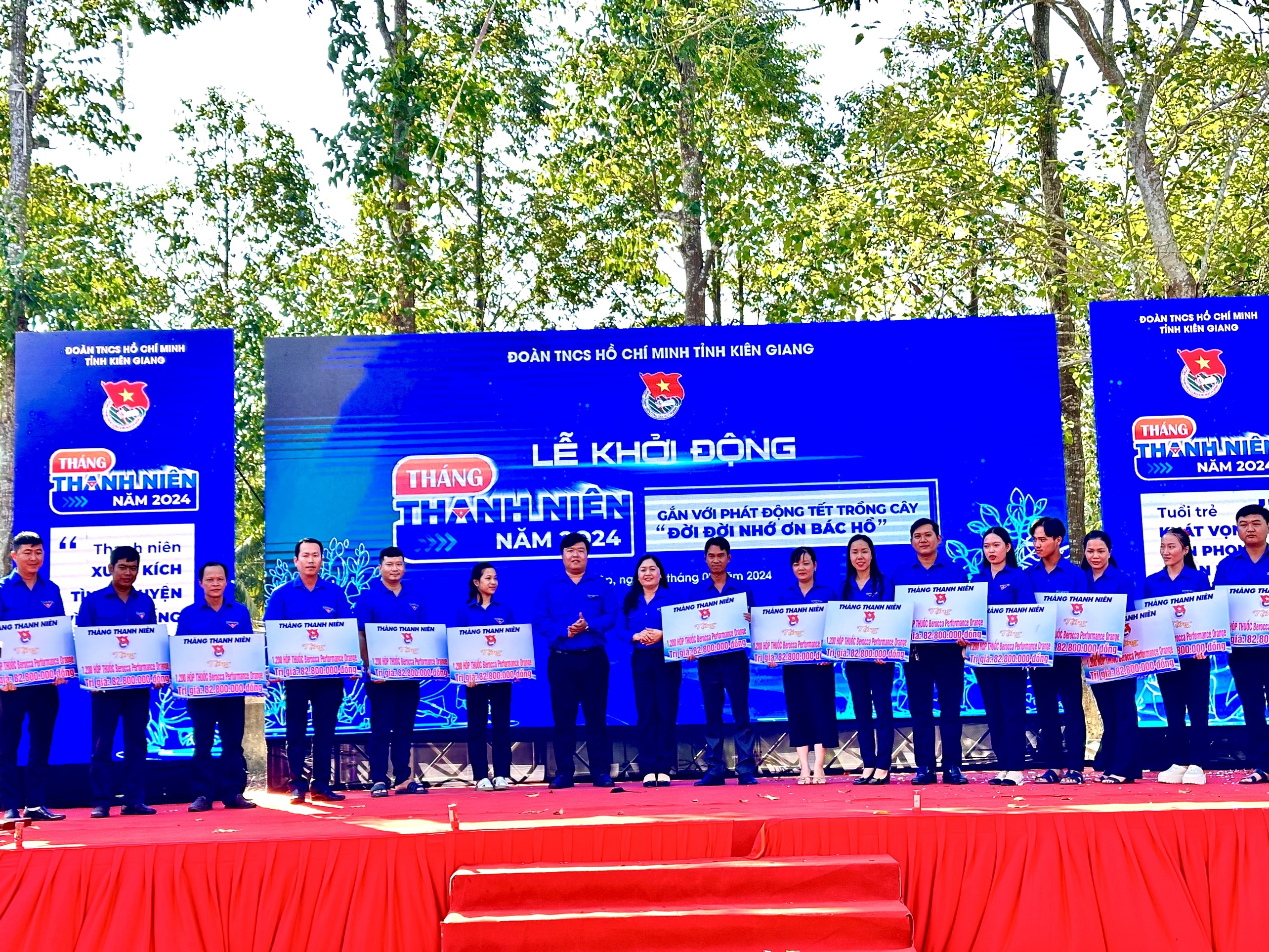 Tại lễ khởi động, Tỉnh đoàn đã vận động các nguồn lực và tổ chức trao bảng tượng trưng các công trình, phần việc sẽ triển khai thực hiện trong Tháng Thanh niên cho các đơn vị với tổng trị giá trên 2 tỷ đồng gồm: Trao tặng 02 căn Nhà Nhân ái trị giá 100 triệu đồng, 50 bộ năng lượng mặt trời xây dựng Công trình Thắp sáng đường biên trị giá 100 triệu đồng cho Huyện đoàn Giang Thành; Tặng cho Huyện đoàn Tân Hiệp 110 suất quà trị giá 55 triệu đồng, 01 Công trình Thể dục ngoài trời trị giá 30 triệu đồng, 01 căn Nhà Nhân ái trị giá 50 triệu đồng; Tặng 30 bộ năng lượng mặt trời xây dựng Công trình Thắp sáng đường quê cho Huyện đoàn Gò Quao trị giá 80 triệu đồng; Tặng Huyện đoàn Vĩnh Thuận và Châu Thành mỗi đơn vị 1.000 cây xanh; Tặng Huyện đoàn An Biên và U Minh Thượng mỗi đơn vị 500 cây xanh; Tặng Huyện đoàn Giồng Riềng 500 cây bông trang; Tặng Thành đoàn Phú Quốc 10 xe đẹp trị giá 10 triệu đồng và tặng Huyện đoàn Vĩnh Thuận 100 bao xi măng trị giá 10 triệu đồng.