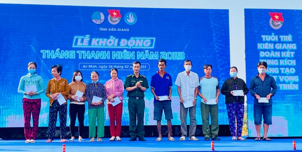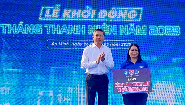 Tại lễ khởi động, Ban Thường vụ Tỉnh đoàn trao nguồn lực thực hiện các công trình, phần việc thực hiện xây dựng nông thôn mới, đô thị văn minh trên địa bàn huyện An Minh, tổng trị giá gần 400 triệu đồng.