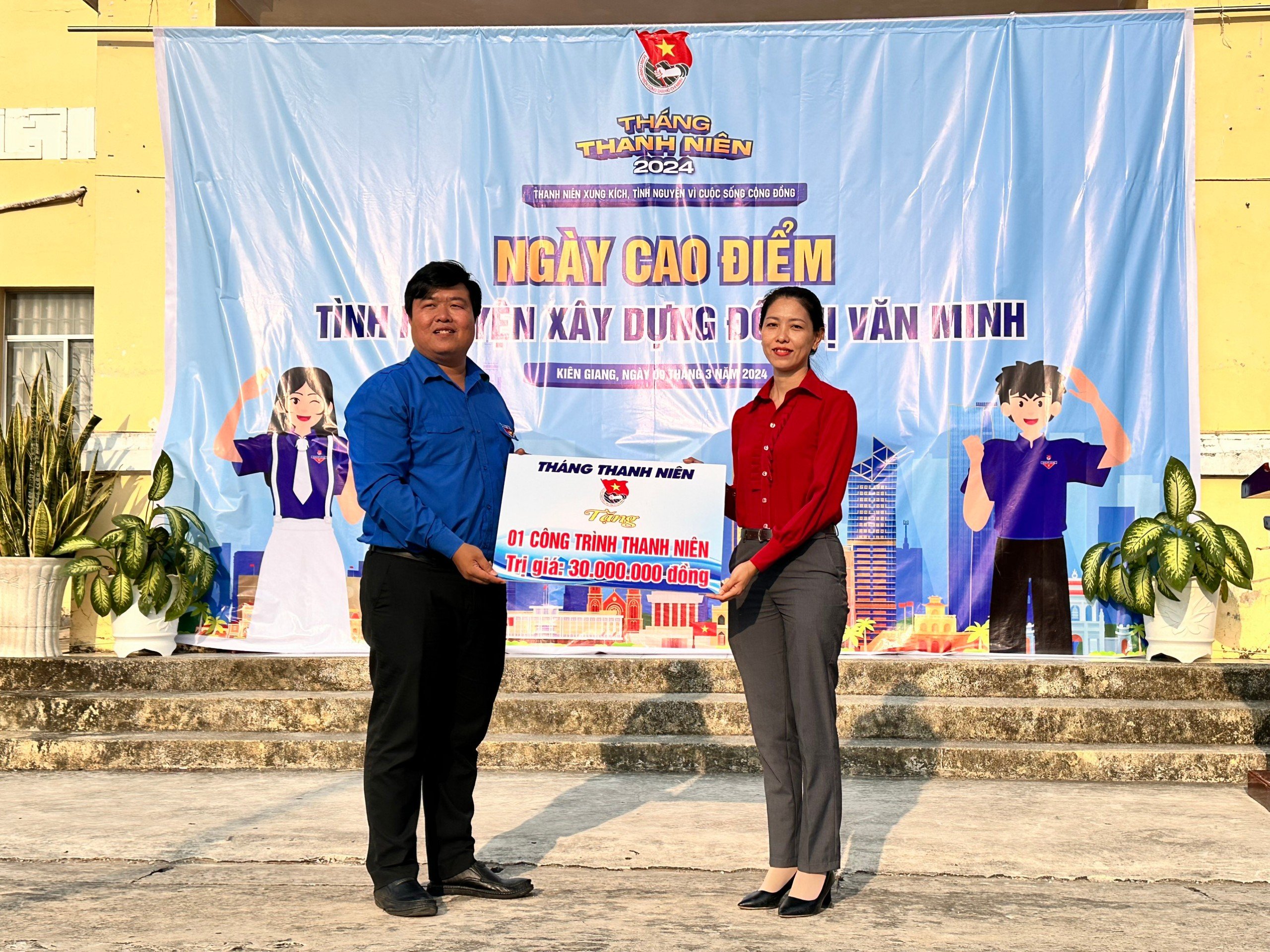 Đồng chí Dư Phạm Hữu Khuyến – Phó Bí thư Tỉnh đoàn trao bảng tượng trưng công trình Thanh niên cho đại diện UBND Thị trấn Thứ Mười Một