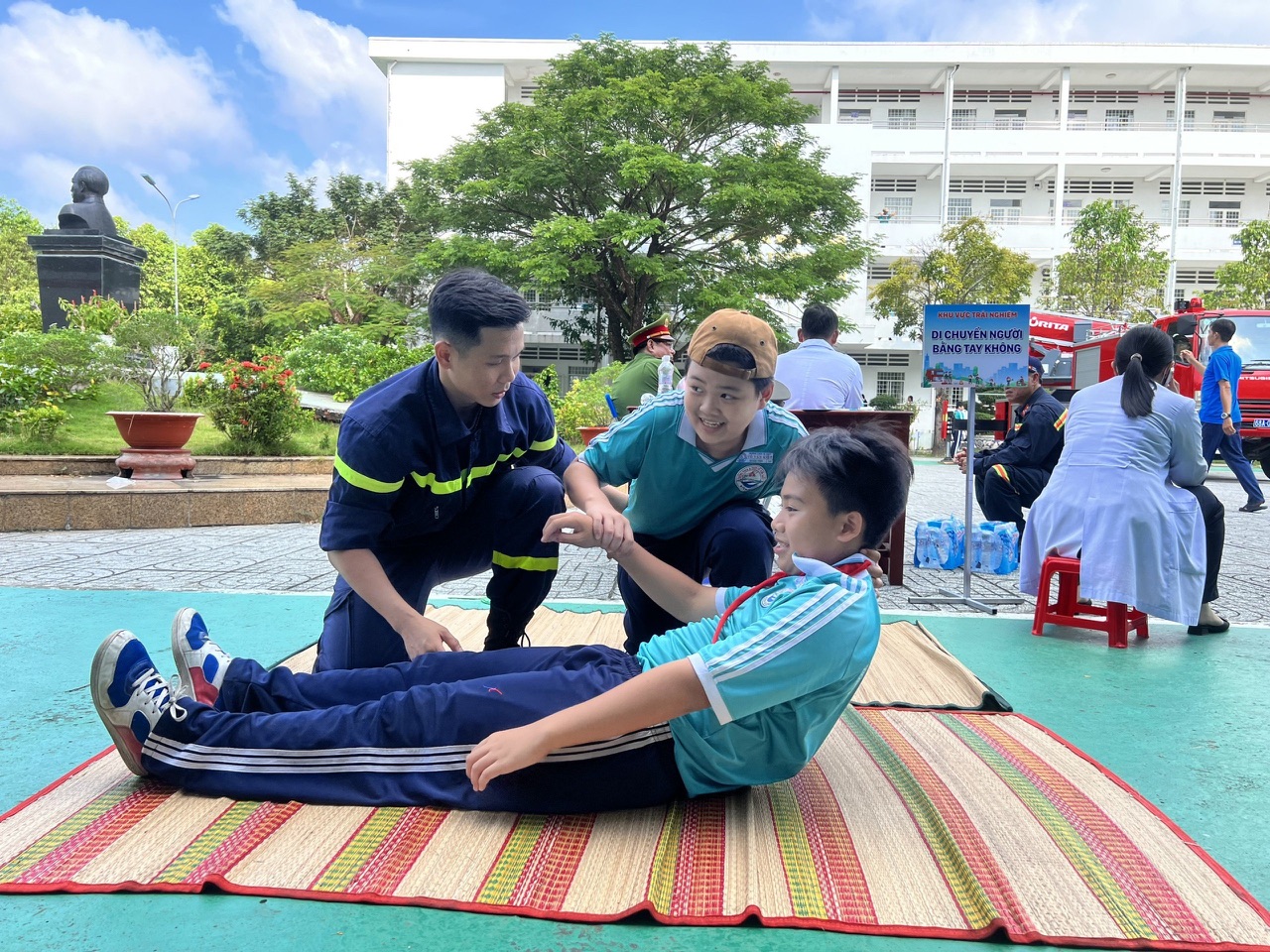 Đặt biệt, chương trình trải nghiệm thực tế “Chúng em làm lính cứu hỏa” đã được tổ chức với nhiều hoạt động ý nghĩa, thiết thực và sôi nổi với nhiều hoạt động như: Tuyên truyền, phổ biến pháp luật, kiến thức cơ bản và các biện pháp bảo đảm an toàn PCCC; giới thiệu một số phương tiện, trang thiết bị phục vụ công tác chữa cháy, CNCH: quần, áo, mũ, ủng, lăng, vòi, các thiết bị chữa cháy, CNCH cơ bản trang bị trên các xe ôtô chữa cháy, CNCH...; truyền, phổ biến pháp luật, kiến thức cơ bản và các biện pháp bảo đảm an toàn PCCC; giới thiệu một số phương tiện, trang thiết bị phục vụ công tác chữa cháy, CNCH: quần, áo, mũ, ủng, lăng, vòi, các thiết bị chữa cháy, CNCH cơ bản trang bị trên các xe ôtô chữa cháy, CNCH...; Giả định tình huống cháy (tại tầng 2 khu vực phòng học) và triển khai các hoạt động chữa cháy, thoát nạn, cứu người: Triển khai đội hình trên xe ô tô chữa cháy phun nước chữa cháy; hướng dẫn cho các em học sinh thực hành thoát nạn theo cầu thang bộ, dây hạ chậm, đội hình cứu người bị nạn từ trên cao...