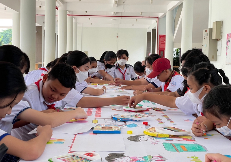 Các bạn đội viên, học sinh tham gia hoạt động vẽ tranh, tô màu với chủ đề “Dũng sĩ nghìn việc tốt tô màu ước mơ”