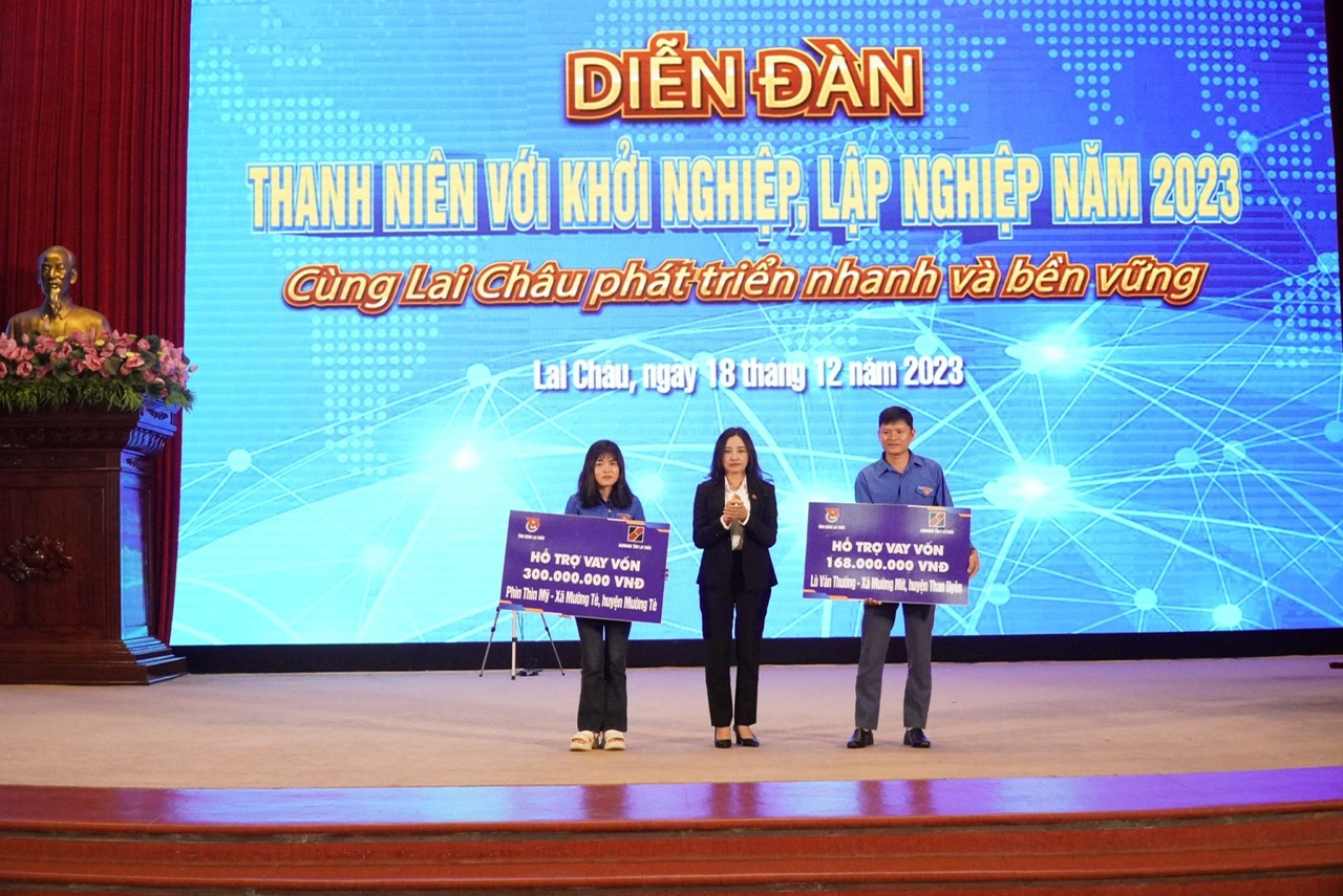 Trong khuôn khổ Diễn đàn, Ban Thường vụ Tỉnh đoàn đã trao nguồn vốn khởi nghiệp cho thanh niên với tổng trị giá 546 triệu đồng; trao giải Cuộc thi dự án khởi nghiệp thanh niên nông thôn tỉnh Lai Châu năm 2023 cho 08 mô hình kinh tế tiêu biểu của thanh niên trên địa bàn tỉnh.
