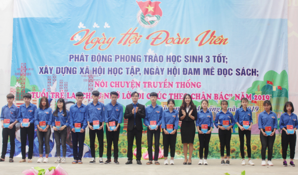 Đồng chí Phạm Ngọc Đang, Phó Bí thư Tỉnh đoàn Lai Châu trao sổ đoàn viên và thẻ đoàn cho các am đoàn viên mới tại Ngày hội