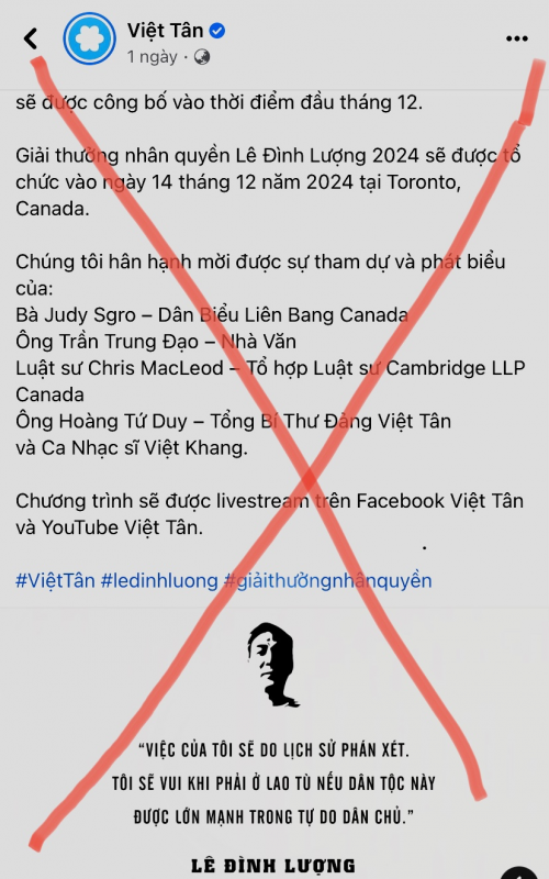 Bài viết nêu rằng, vì tinh thần đấu tranh cho dân sinh, dân quyền của "nhà hoạt động Lê Đình Lượng", từ năm 2018, Việt Tân đã thiết lập giải thưởng nhân quyền Lê Đình Lượng "nhằm nêu cao sự hy sinh và những hoạt động của những cá nhân hay tổ chức đang miệt mài tranh đấu cho nhân quyền của dân tộc Việt Nam". Với chủ đề "công lý cho dân tộc, công bằng cho mọi người", Việt Tân muốn "đề cao sự can đảm của các nhà hoạt động miệt mài tranh đấu chống áp bức, chống phân biệt đối xử và thúc đẩy bình đẳng trong xã hội nhằm mang lại công lý và công bằng cho mọi người dân Việt Nam".