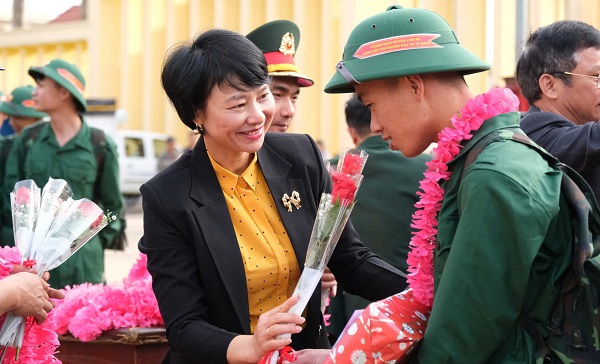 Đồng chí Phạm Thị Phúc, Phó Bí thư Tỉnh ủy, Chủ tịch HĐND tỉnh tặng hoa và gửi lời chúc đến các tân binh
