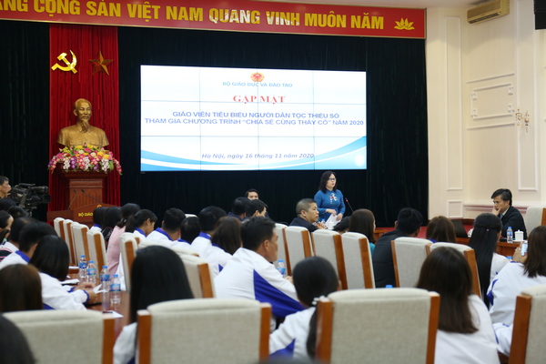 Chiều 16/11, Thứ trưởng Bộ GD&ĐT Ngô Thị Minh có buổi gặp thân mật 63 giáo viên tiêu biểu người dân tộc thiểu số tham gia chương trình “Chia sẻ cùng thầy cô” năm 2020. Cùng dự buổi gặp mặt có đồng chí Nguyễn Ngọc Lương, Bí thư TƯ Đoàn, Chủ tịch Hội đồng Đội TƯ; đồng chí Nguyễn Tường Lâm, Phó Chủ tịch Thường trực TƯ Hội LHTN Việt Nam.
