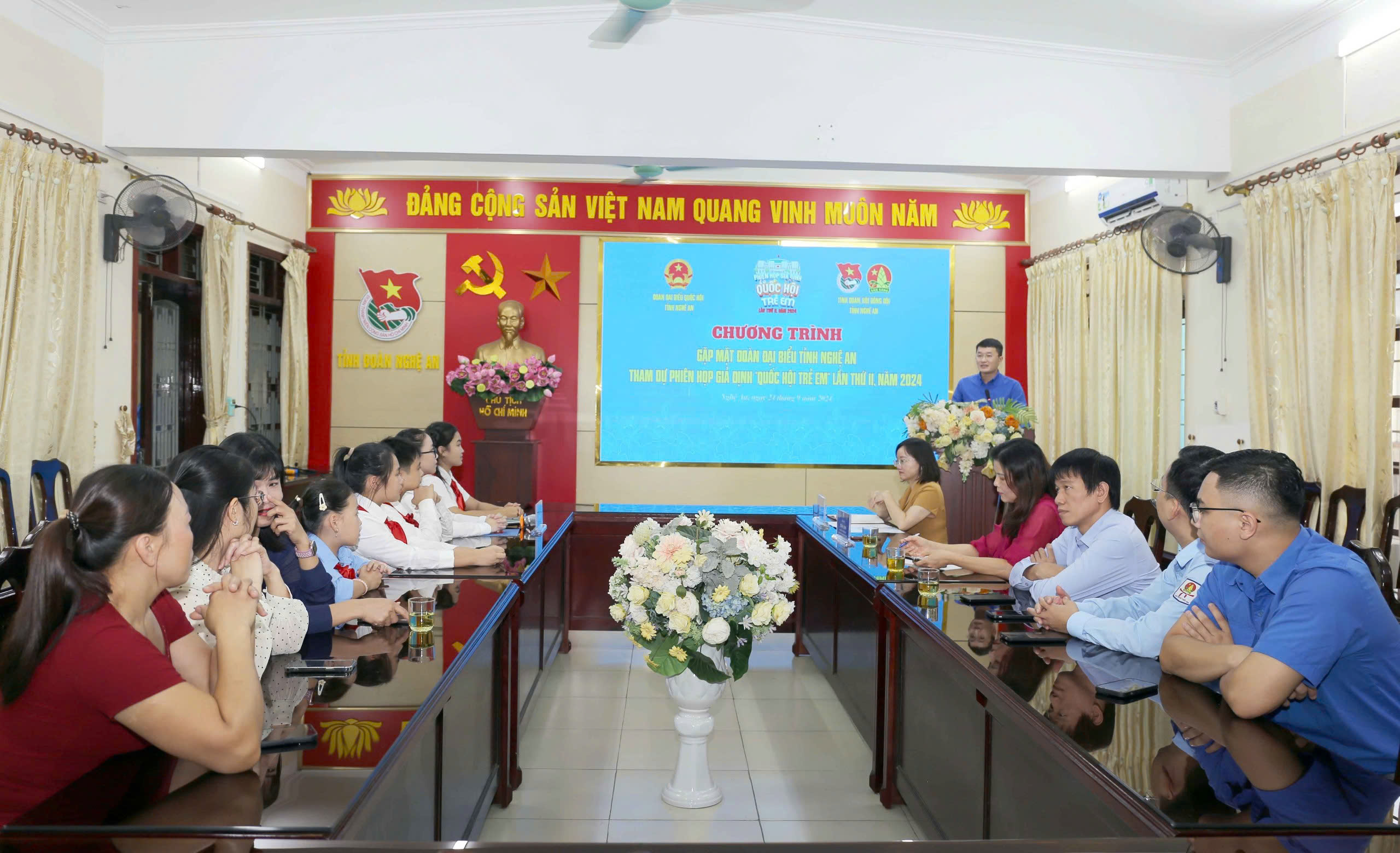 Các đại biểu Nghệ An tham dự Phiên họp giả định "Quốc hội trẻ em" năm 2024 và đại diện Đoàn Đại biểu Quốc hội tỉnh, Thường trực Tỉnh đoàn và các thầy cô giáo, huyện - thành đoàn tại buổi gặp mặt