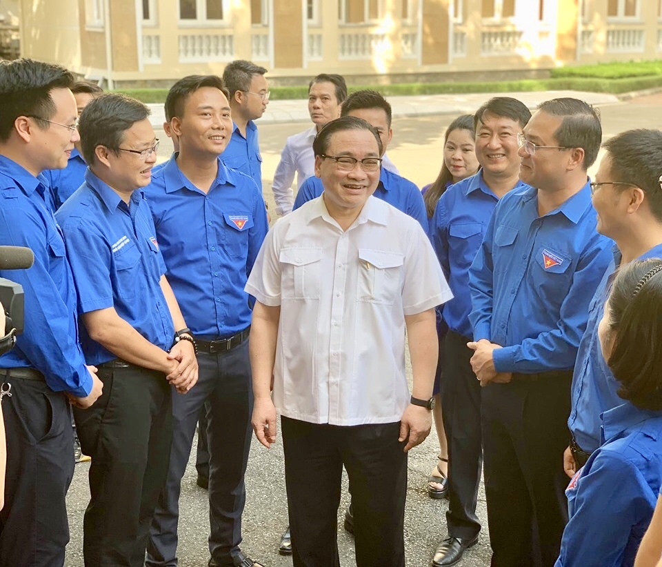 Bí thư Thành ủy Hà Nội Hoàng Trung Hải chia sẻ với các đồng chí Thường trực Thành đoàn Hà Nội