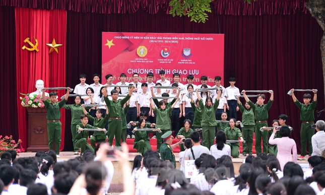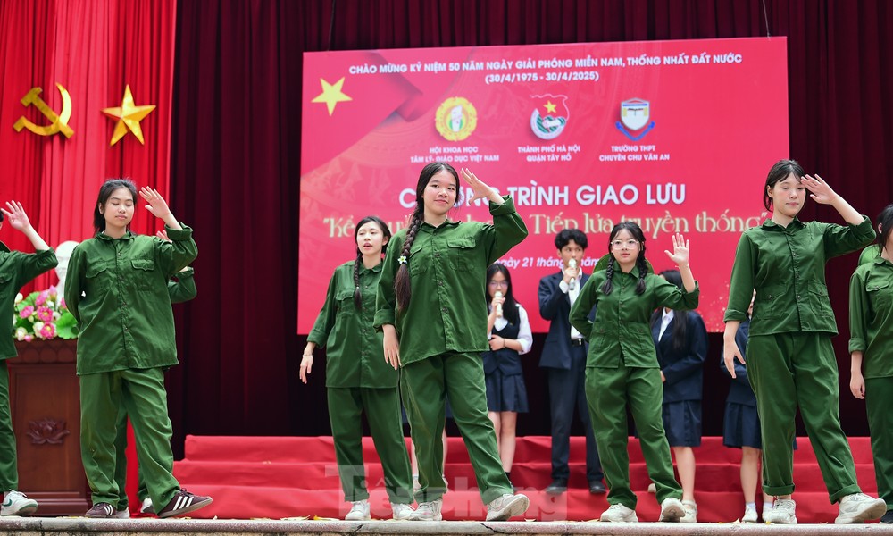 Cùng với các cựu chiến binh, cựu thanh niên xung phong, học sinh và giáo viên trường THPT Chu Văn An đã tái hiện khí thế hào hùng “xẻ dọc Trường Sơn đi cứu nước”, “xếp bút nghiên lên đường”… qua những tiết mục văn nghệ, như: "Cô gái mở đường", "Tổ quốc gọi tên mình", "Tiến về Sài Gòn".