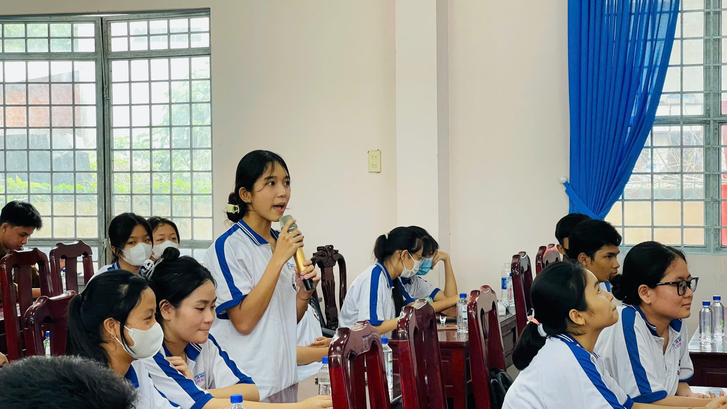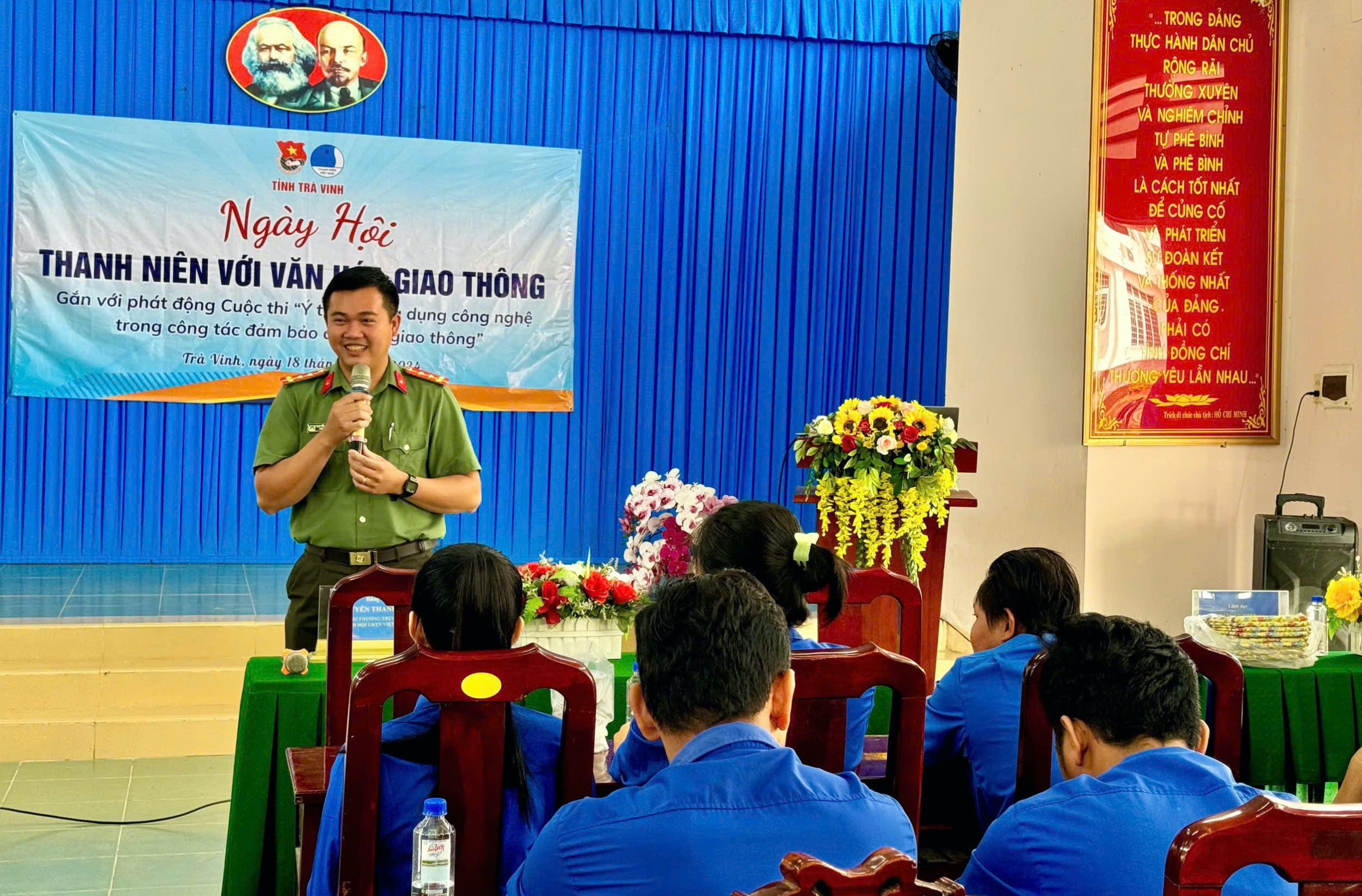 Chiều cùng ngày đã diễn ra buổi sinh hoạt chuyên đề về văn hóa giao thông cho các em học sinh trung học phổ thông. Các em được báo cáo viên trang bị, hướng dẫn kỹ năng lái xe an toàn, sử dụng xe máy, xe đạp điện, nón bảo hiểm đúng cách, an toàn, đặc biệt là cuộc thi Rung chuông vàng “Tìm hiểu về Luật giao thông đường bộ – Văn hóa giao thông”.