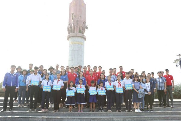 Đoàn đại biểu tham gia Liên hoan Câu lạc bộ Lý luận trẻ cụm Sông Hậu chụp ảnh lưu niệm với các em học sinh tại Tượng đài “Vì an ninh Tổ quốc”, tại Khu Di tích lịch sử An ninh Khu IX