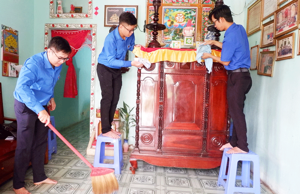 Đoàn viên, thanh niên thực hiện mô hình Người con hiếu thảo dọn dẹp vệ sinh tại nhà Mẹ Việt Nam Anh hùng Trần Thị Năm