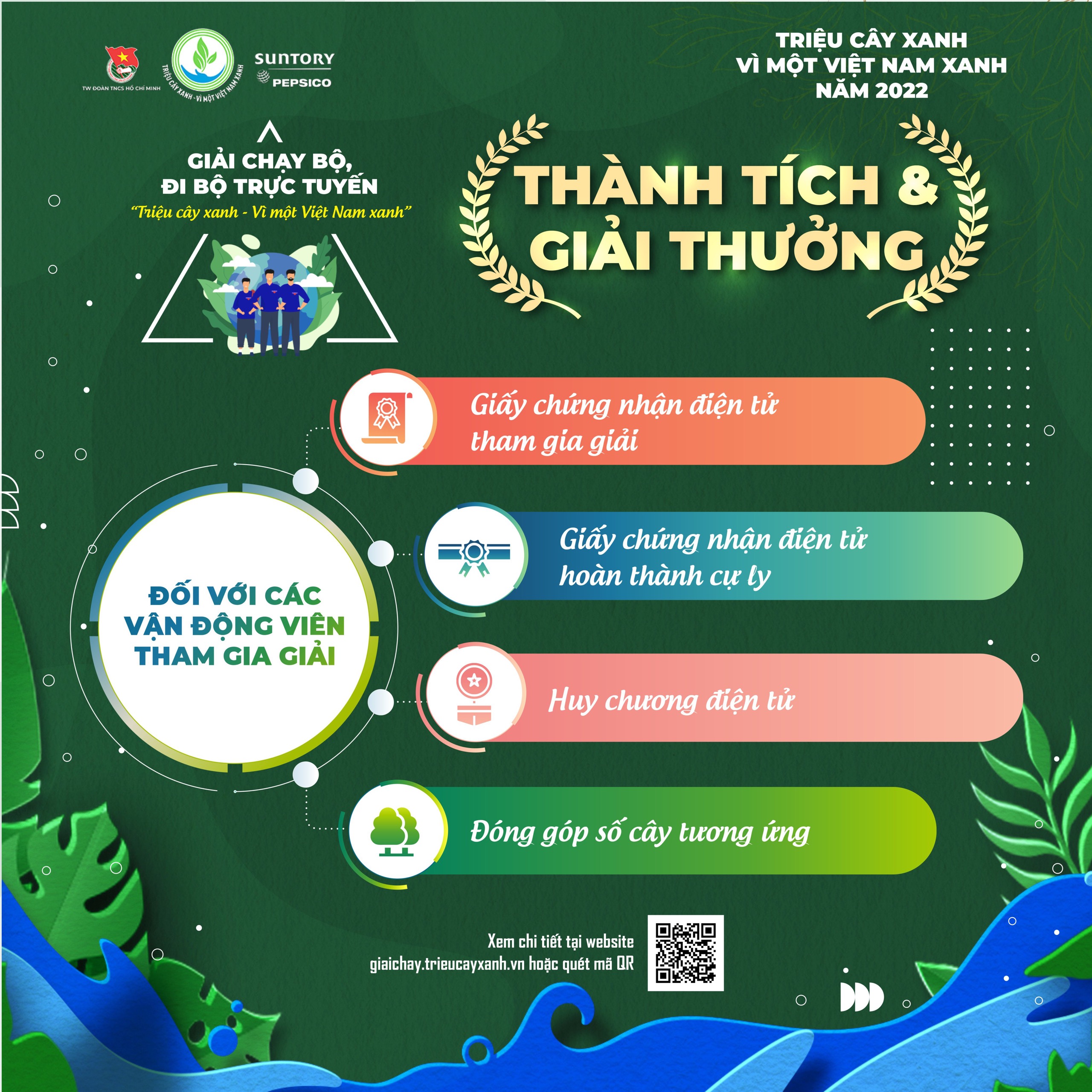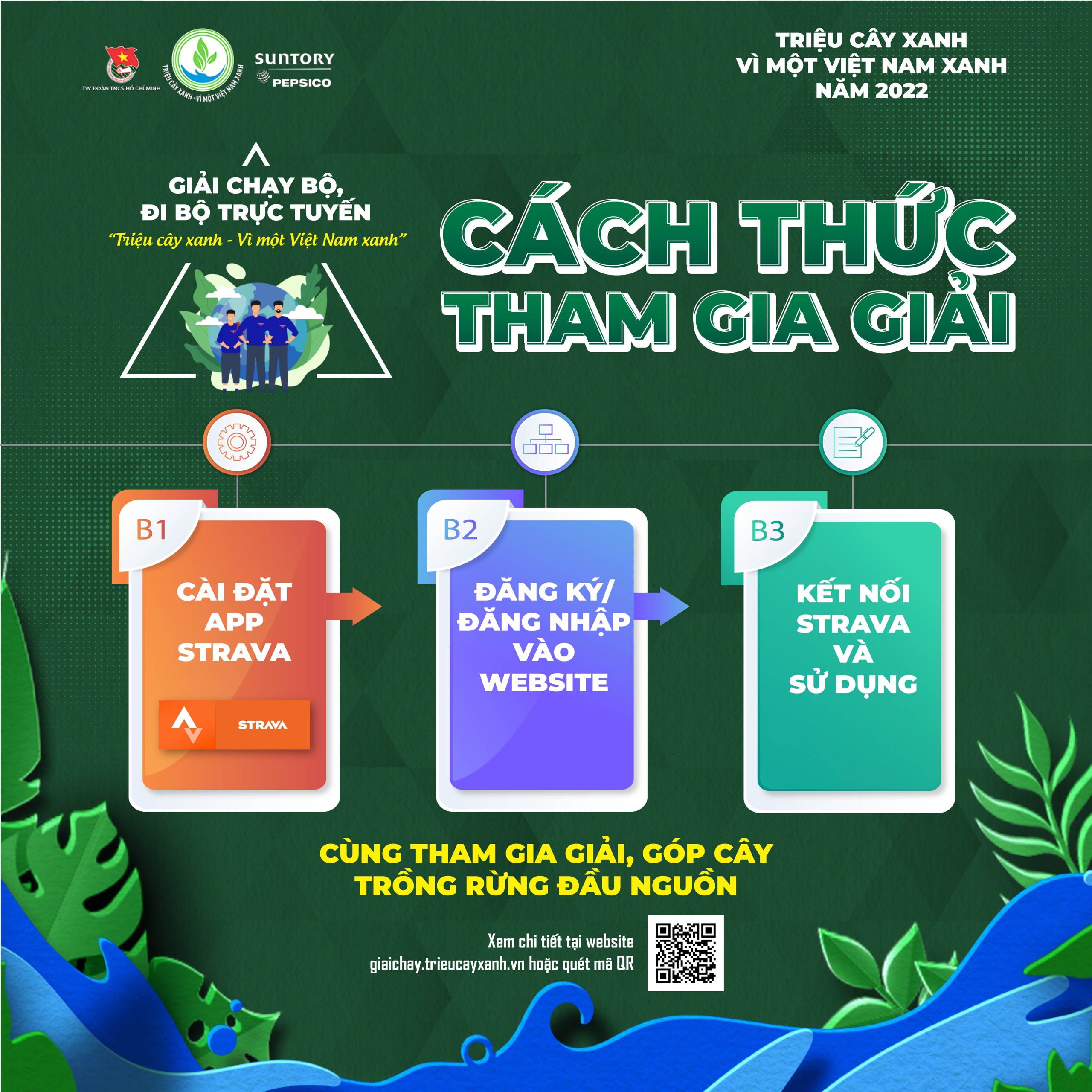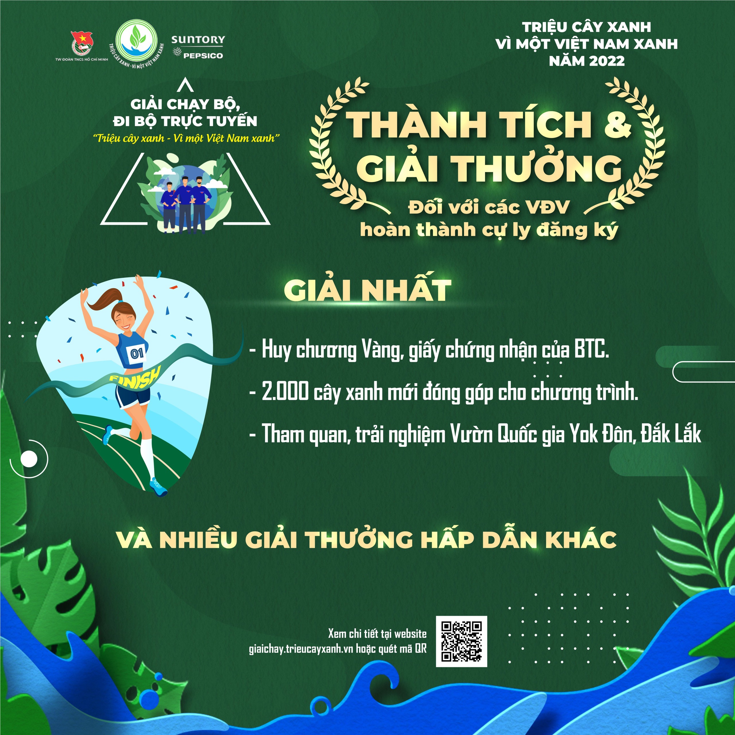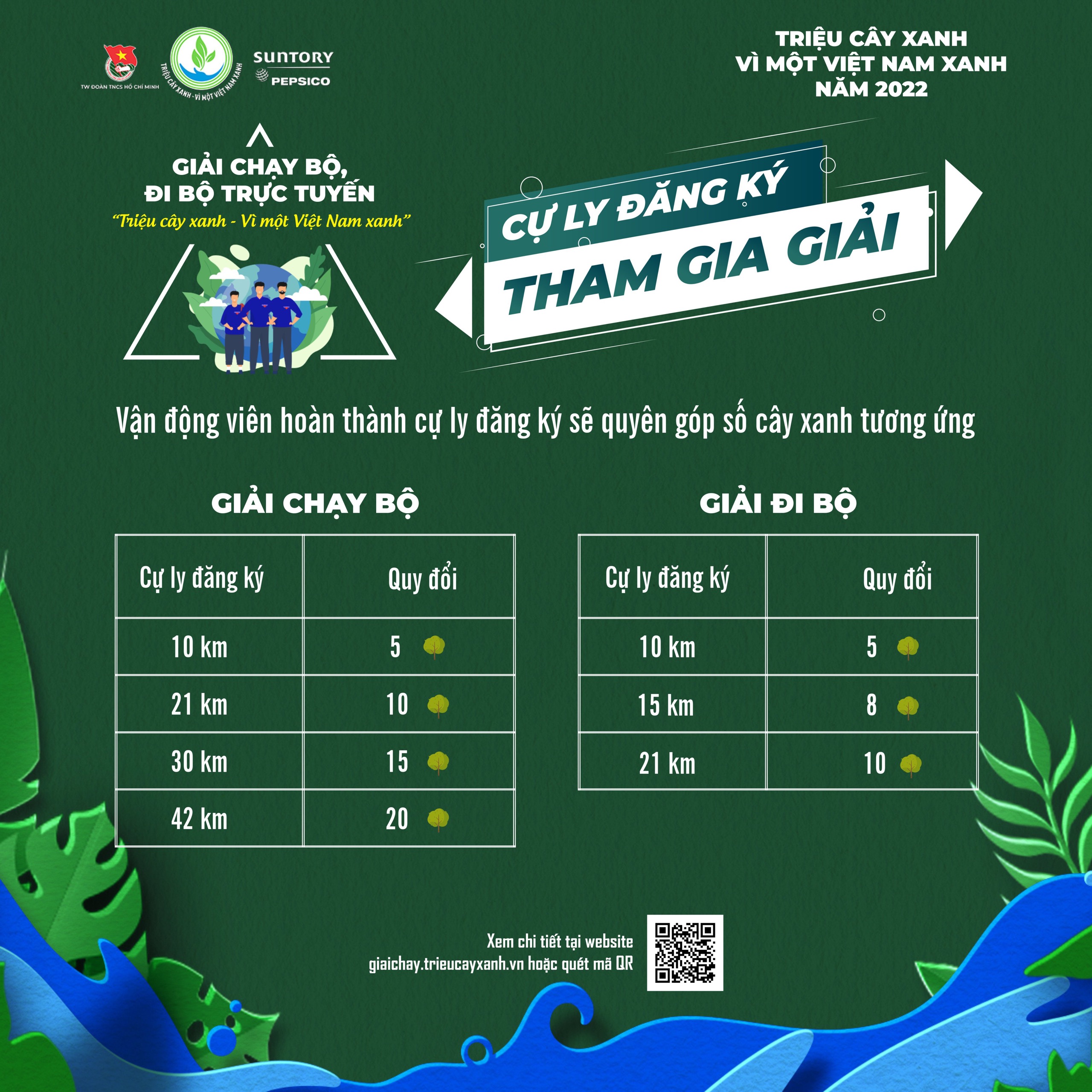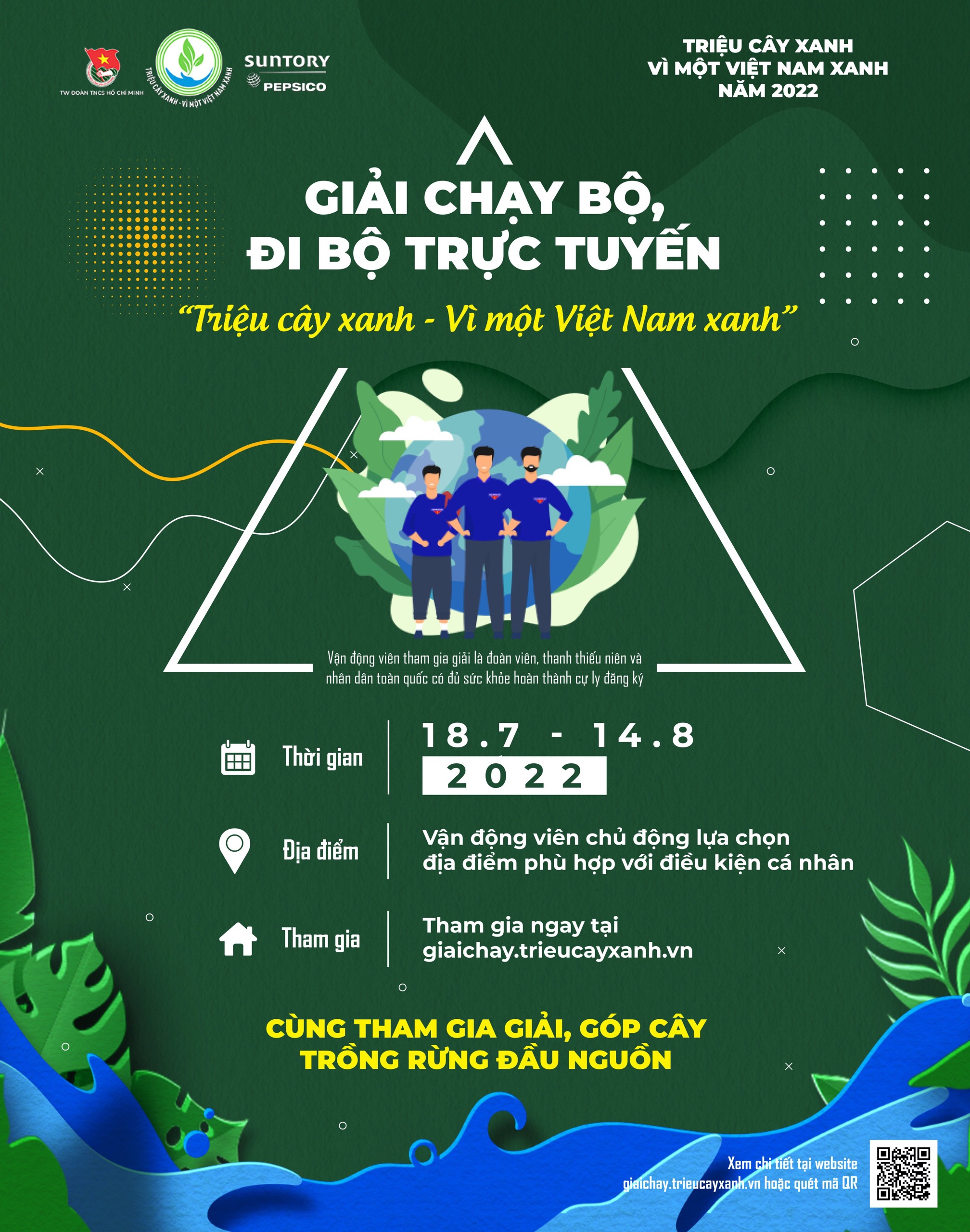 ĐTN: Giải chạy bộ, đi bộ trực tuyến “Triệu cây xanh - Vì một Việt Nam xanh” là hoạt động nằm trong Chương trình “Triệu cây xanh – Vì một Việt Nam xanh” năm 2022 do Trung ương Đoàn TNCS Hồ Chí Minh phối hợp với Công ty TNHH Nước Giải khát Suntory PepsiCo Việt Nam tổ chức.