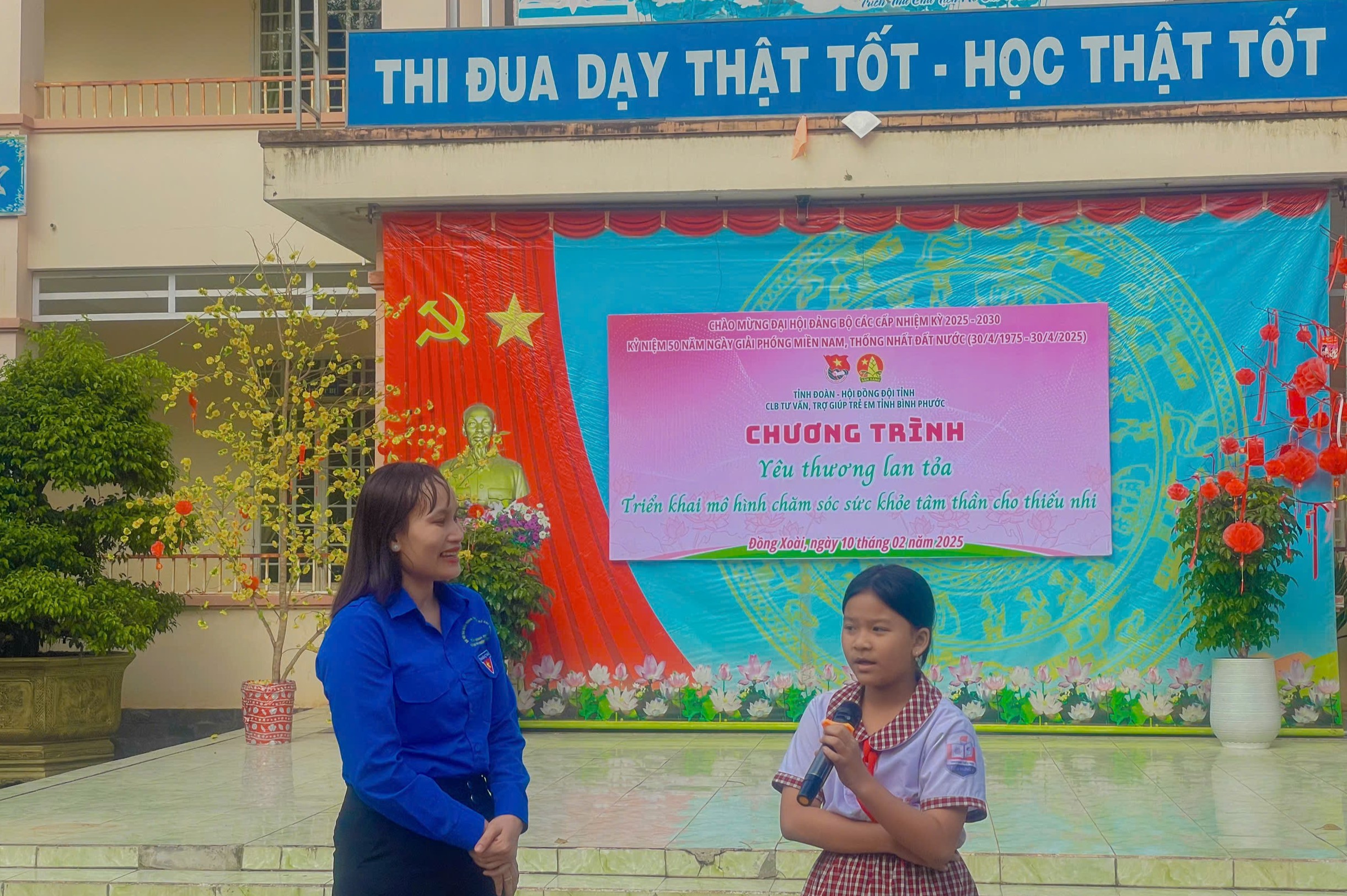 Cũng tại chương trình, đồng chí Thạch Thị Thuỳ Dương, Phó Trưởng ban phụ trách Ban Tuyên giáo - Thanh thiếu nhi trường học Tỉnh đoàn, Phó Chủ tịch thường trực Hội đồng Đội tỉnh đã tuyên truyền cho các thầy cô giáo và các em đội viên, thiếu nhi Trường Tiểu học Tiến Hưng A (thành phố Đồng Xoài) hiểu về tầm quan trọng của sức khỏe tâm thần trong trường học; các giai đoạn phát triển của trẻ em; các biện pháp nâng cao sức khỏe tâm thần tích cực cho học sinh trong trường học; cách nhận diện các dấu hiệu bất thường về sức khỏe tâm thần của học sinh;… Qua đó, giúp tăng cường các yếu tố bảo vệ trẻ em tại trường học, làm giảm các nguy cơ và hậu quả đối với nhóm trẻ em dễ bị tổn thương.