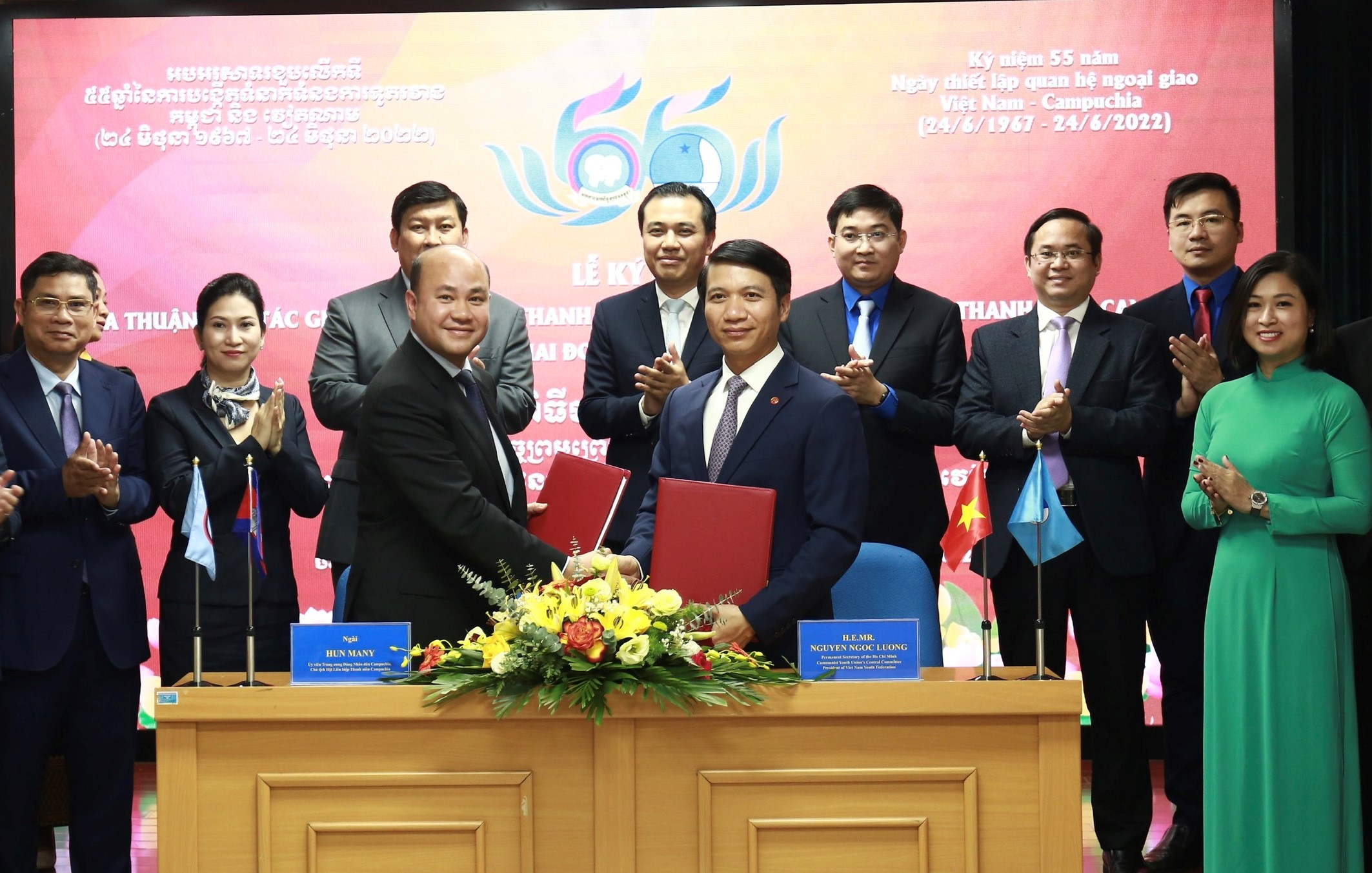 Anh Nguyễn Ngọc Lương, Bí thư thường trực Trung ương Đoàn, Chủ tịch Hội Liên hiệp Thanh niên Việt Nam và anh Hun Many, Ủy viên Trung ương Đảng Nhân dân Campuchia, Chủ tịch Hội Liên hiệp Thanh niên Campuchia ký kết thoả thuận hợp tác giữa Hội Liên hiệp Thanh niên Việt Nam và Hội Liên hiệp Thanh niên Campuchia giai đoạn 2022 – 2027. Ảnh: Bảo Anh
