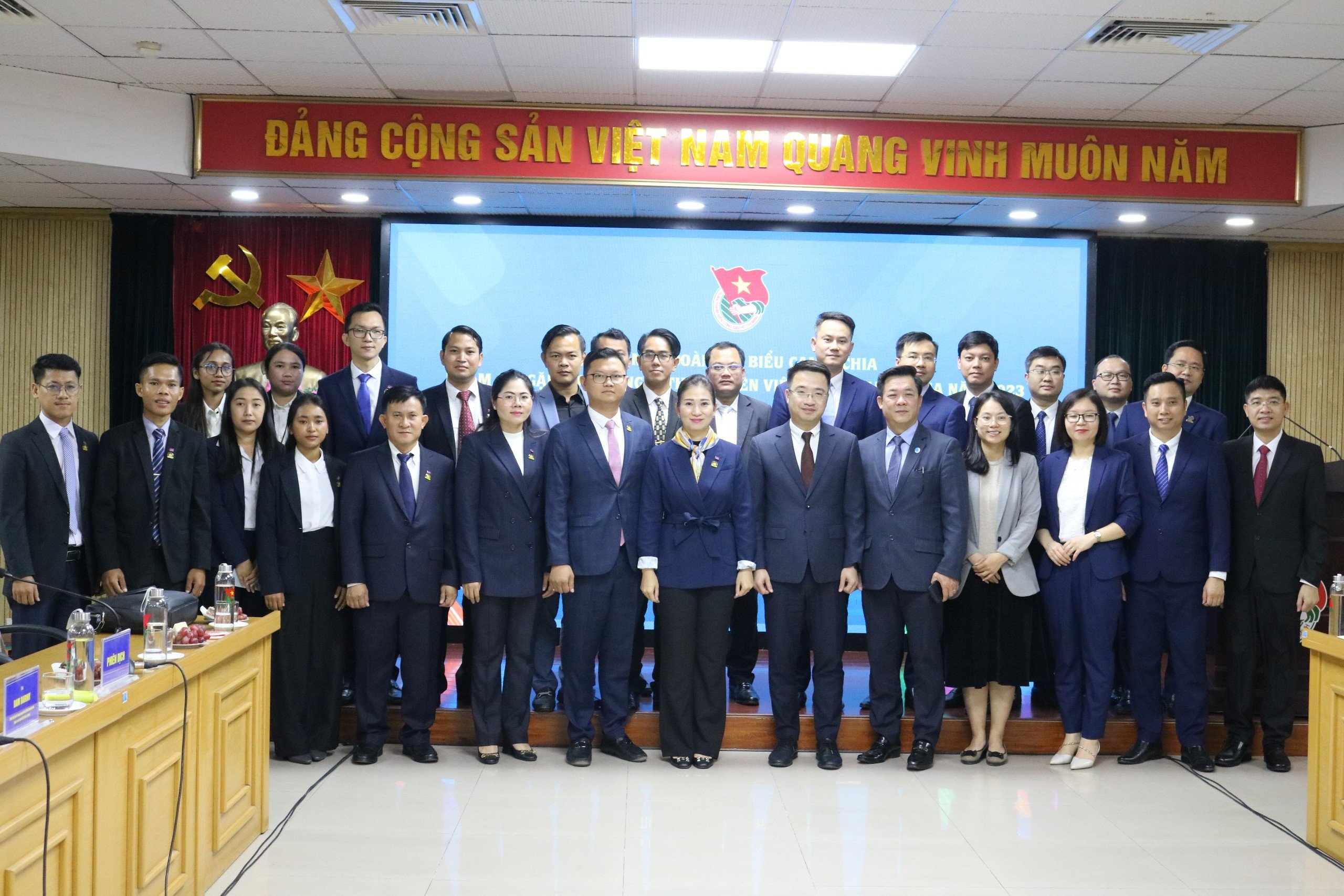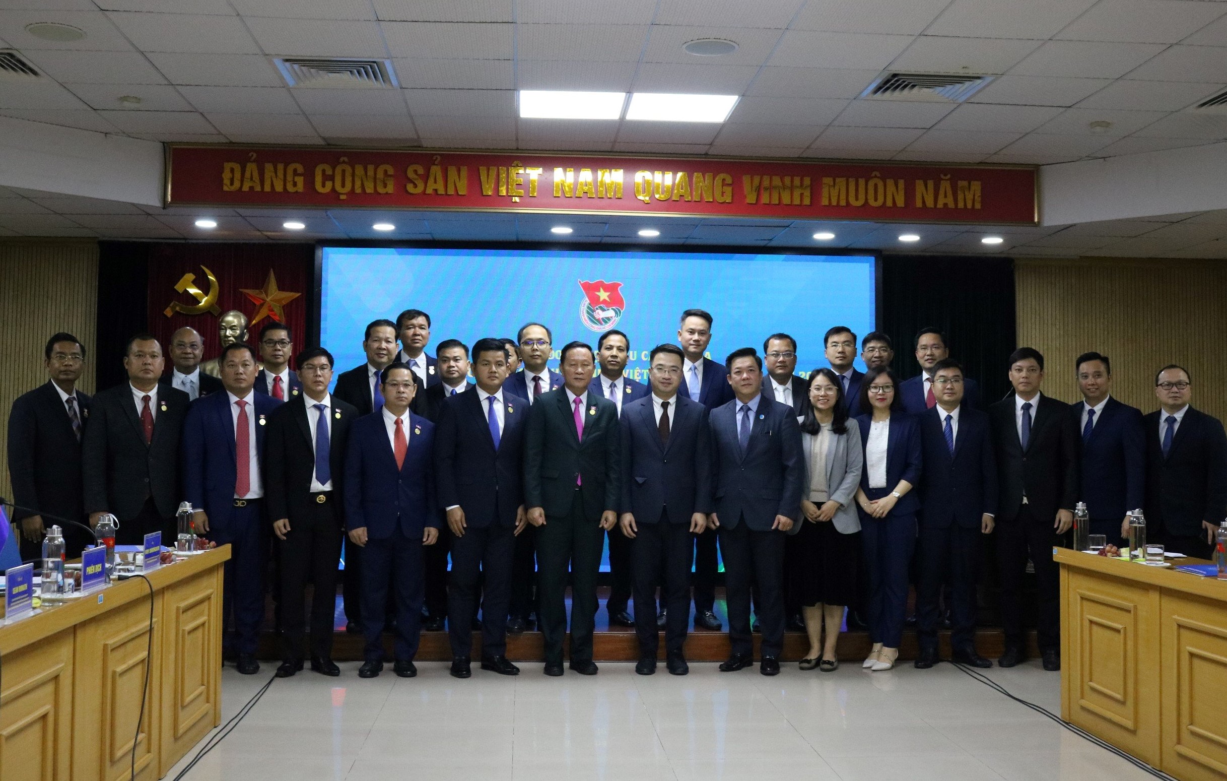 Bí thư Trung ương Đoàn Nguyễn Tường Lâm cùng lãnh đạo các Ban, đơn vị Trung ương Đoàn chụp hình lưu niệm với Đoàn đại biểu Ban Thanh niên Đảng Nhân dân Campuchia