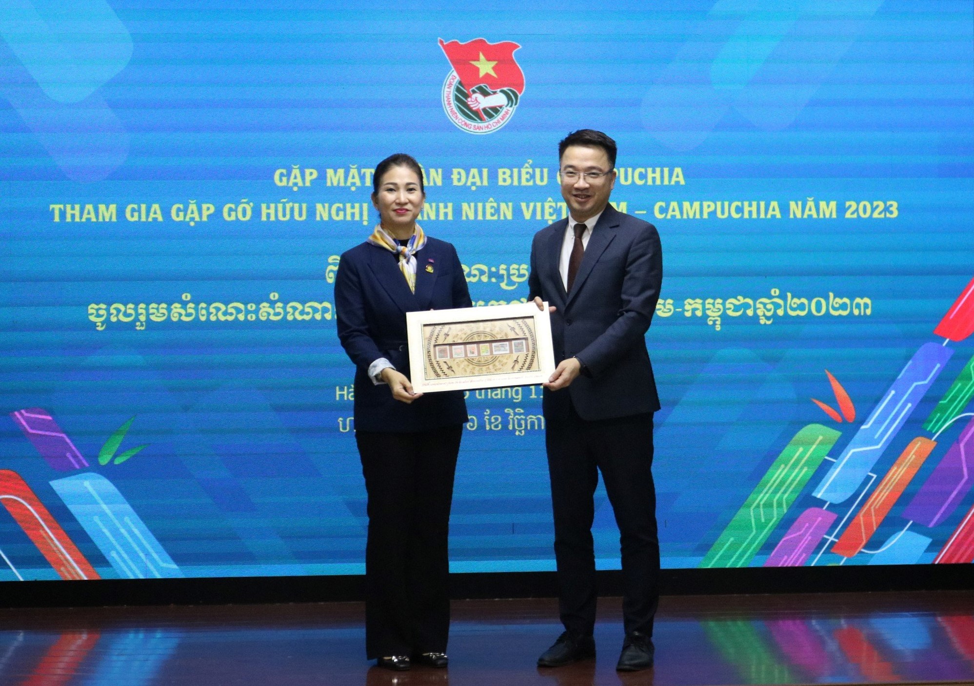 Bí thư Trung ương Đoàn TNCS Hồ Chí Minh Nguyễn Tường Lâm trao tặng quà cho Phó Chủ tịch Ban Thanh niên Trung ương Đảng CPP Sean Borath