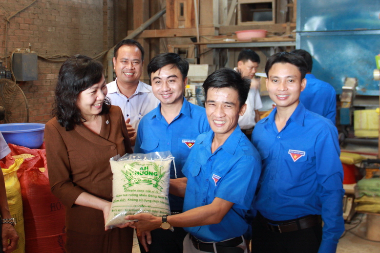Phó Bí thư Thường trực Tỉnh ủy Huỳnh Thị Hằng (áo nâu) và Bí thư Tỉnh Đoàn Trần Quốc Duy (thứ 4, từ trái sang) đến thăm mô hình sản xuất gạo ruộng An Khương và động viên startup Nguyễn Văn Công