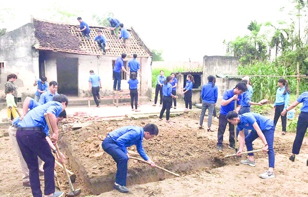 Đoàn viên thanh niên huyện Thọ Xuân tham gia đóng góp ngày công xây dựng ngôi nhà Khăn quàng đỏ cho gia đình học sinh có hoàn cảnh khó khăn xã Thọ Thắng