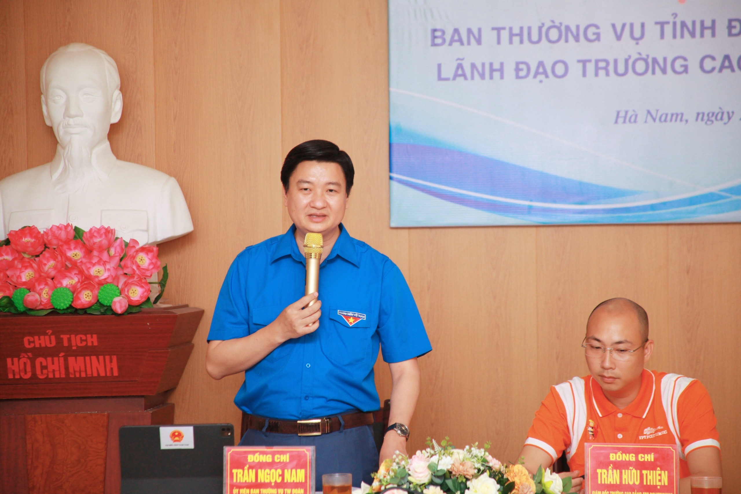 Phát biểu tại buổi làm việc, đồng chí Trần Ngọc Nam - Ủy viên BTV Trung ương Đoàn, TUV, Bí thư Tỉnh đoàn, Chủ tịch Hội LHTN Việt Nam tỉnh mong muốn trường cao đẳng FPT Polytechnic trong thời gian tới sẽ tích cực phối hợp với các cấp bộ Đoàn trên địa bàn tỉnh trong việc nâng cao năng lực số, cho thanh thiếu niên Hà Nam giai đoạn 2023 - 2027, hỗ trợ các cấp bộ Đoàn trong việc triển khai các công trình, phần việc, các mô hình ứng dụng chuyển đổi số như: số hóa các di tích lịch sử, địa chỉ đỏ, danh lam thắng cảnh; tư vấn hướng nghiệp, tuyển sinh; đào tạo nguồn nhân lực có trình độ chuyên môn về các ngành công nghệ thông tin đáp ứng nguồn nhân lực làm việc trong môi trường chuyển đổi số tại các cơ quan Nhà nước và các doanh nghiệp tại khu, cụm công nghiệp trên địa bàn tỉnh.