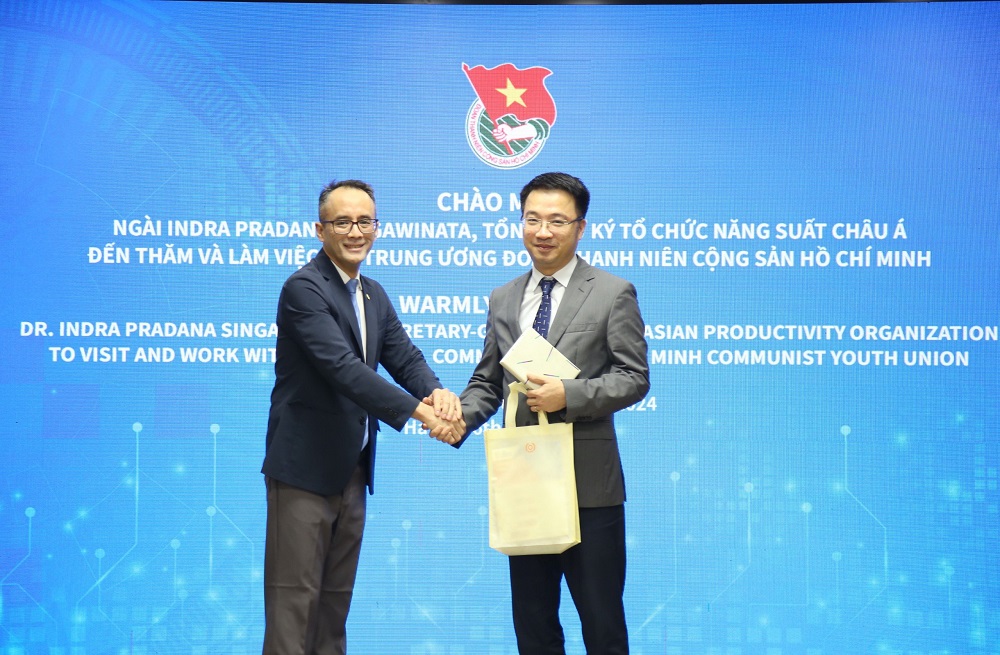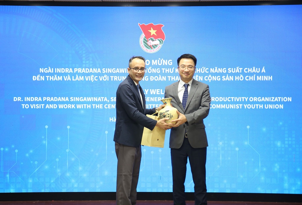 Ông Indra Pradana Singawinata- Tổng Thư ký Tổ chức Năng suất Châu Á trao tặng quà cho Bí thư T.Ư Đoàn Nguyễn Tường Lâm