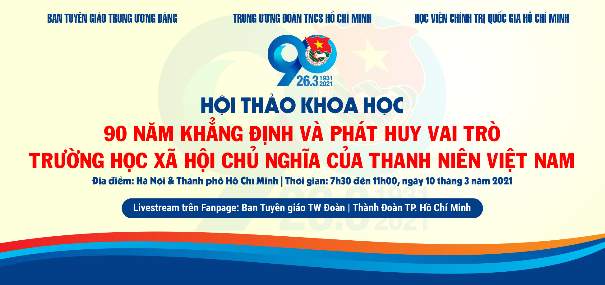 Hội thảo sẽ diễn ra theo hình thức trực tuyến tại 02 điểm cầu Hà Nội và Thành phố Hồ Chí Minh. Điểm cầu Hà Nội đặt tại Trung tâm Hội nghị Quốc tế (Số 11, Lê Hồng Phong, Ba Đình, Hà Nội) và điểm cầu Thành phố Hồ Chí Minh tại Hội trường Thành đoàn Thành phố Hồ Chí Minh (số 1, Phạm Ngọc Thạch, quận 1, thành phố Hồ Chí Minh).