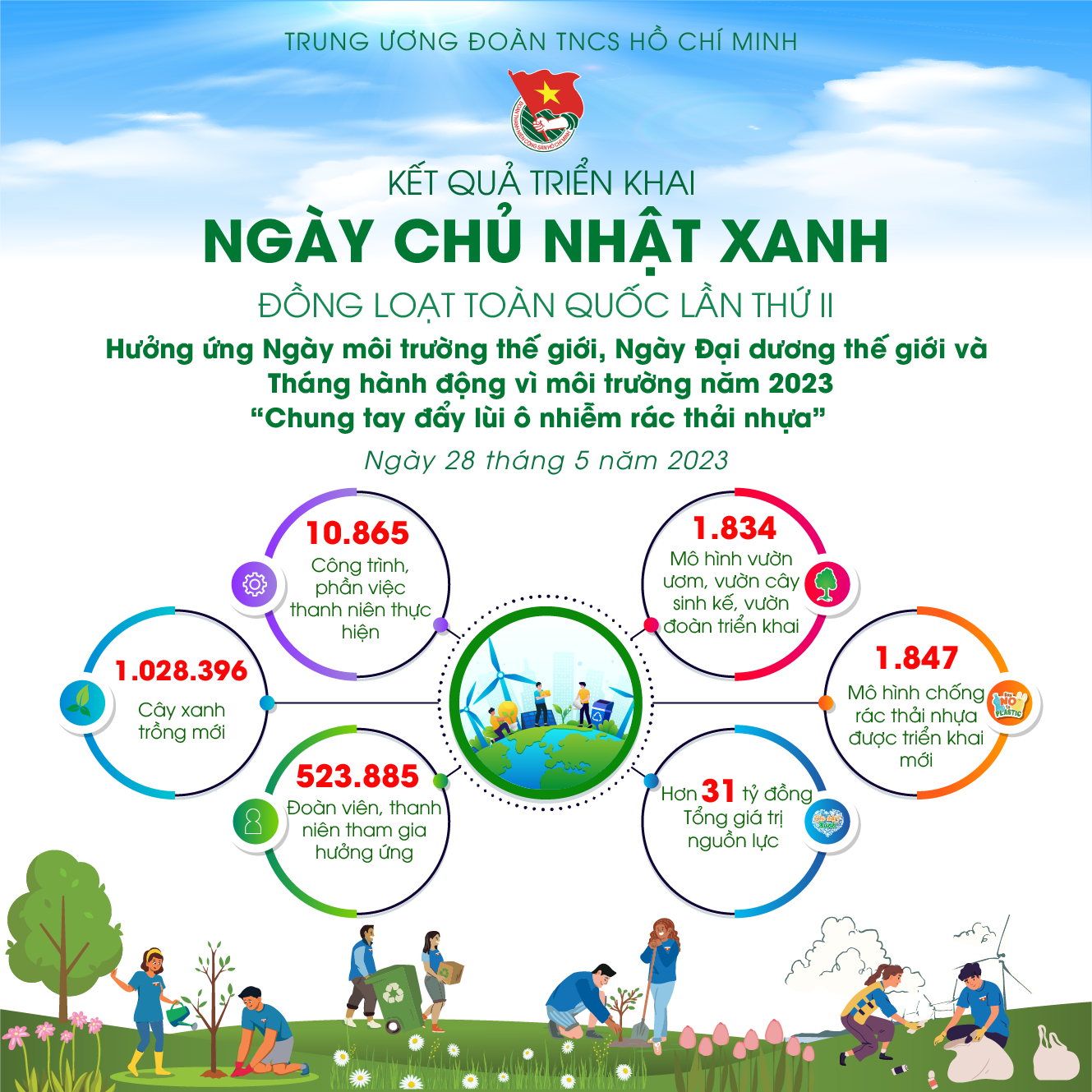 Ngày 28/5/2023 (Chủ nhật), 100% cấp huyện trên toàn quốc, trong đó, Trung ương chỉ đạo điểm tại 03 tỉnh Thái Bình, Thanh Hóa, Vĩnh Long triển khai ra quân Ngày Chủ nhật xanh lần thứ II năm 2023.