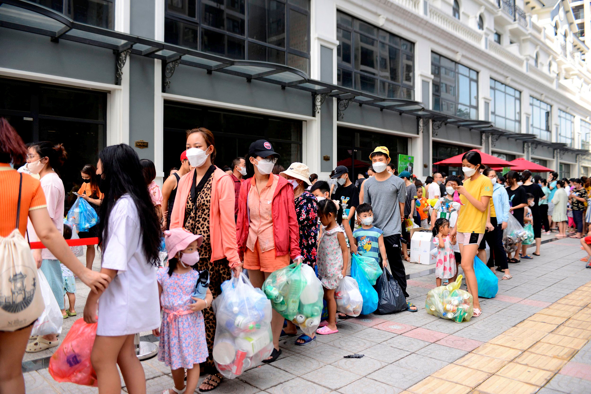 Người đi đổi rác xếp thành hàng dài