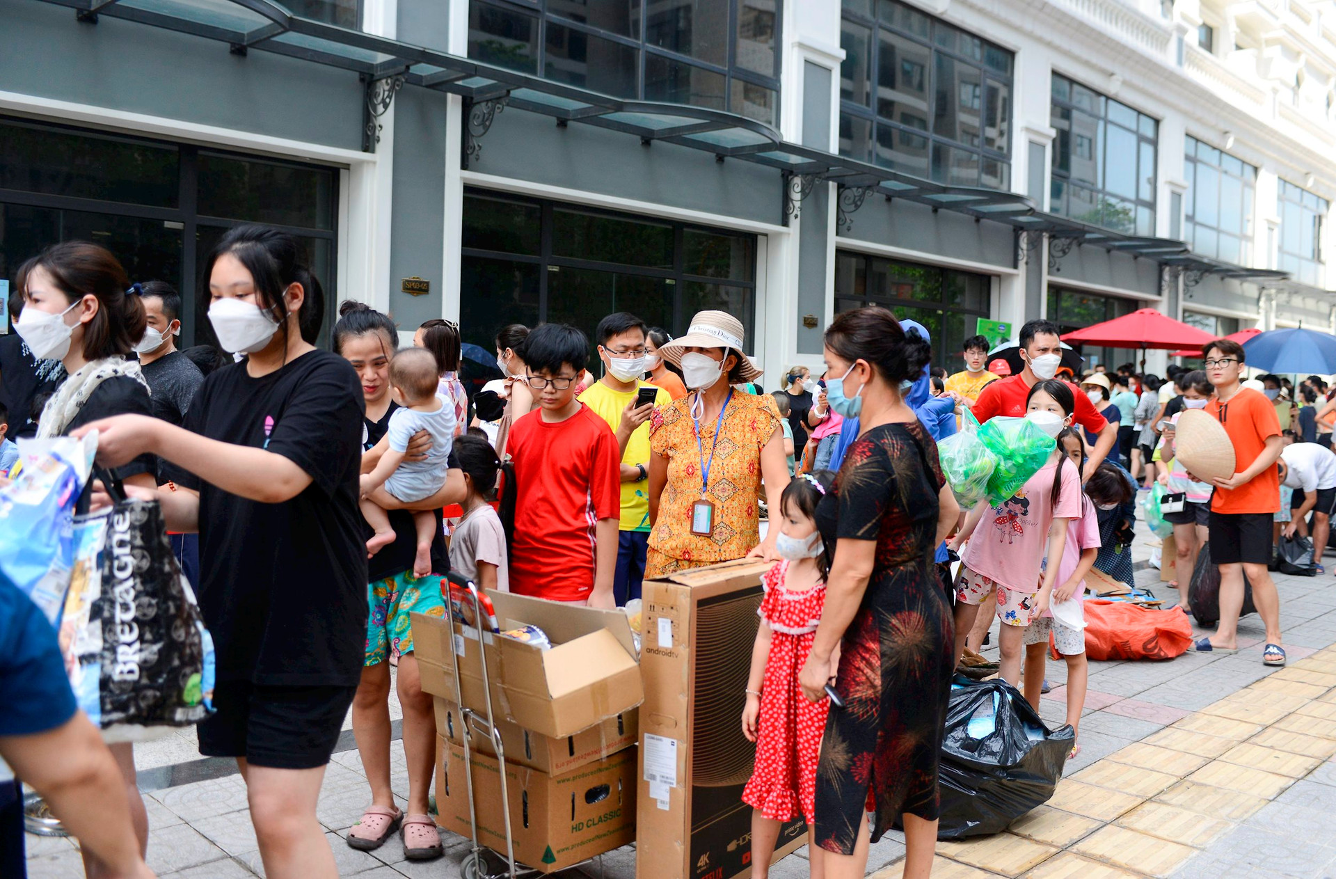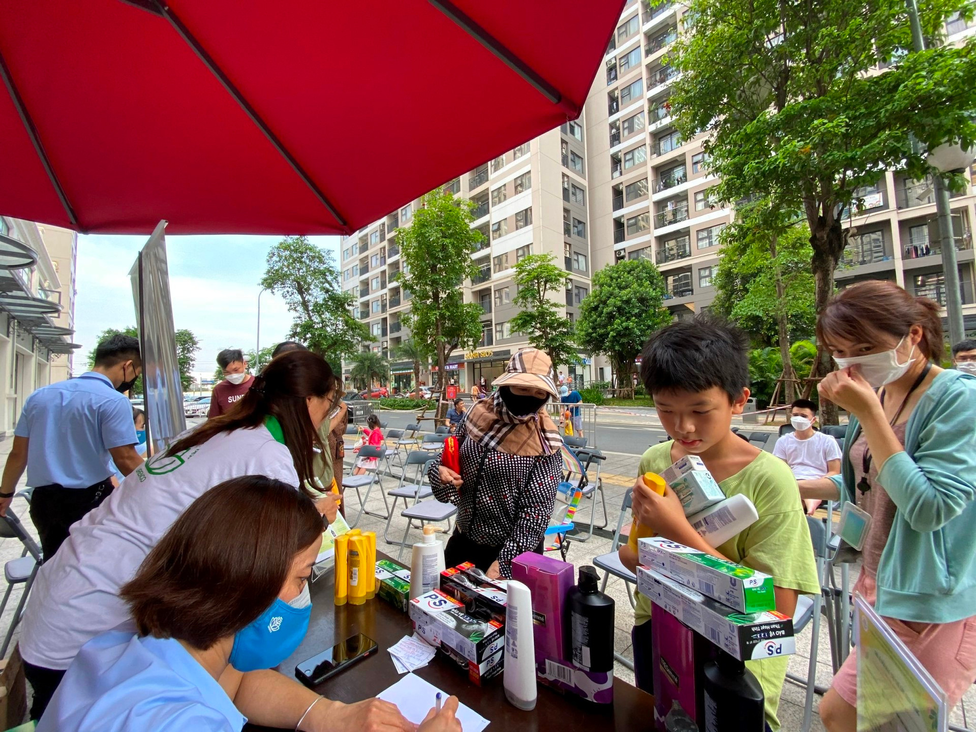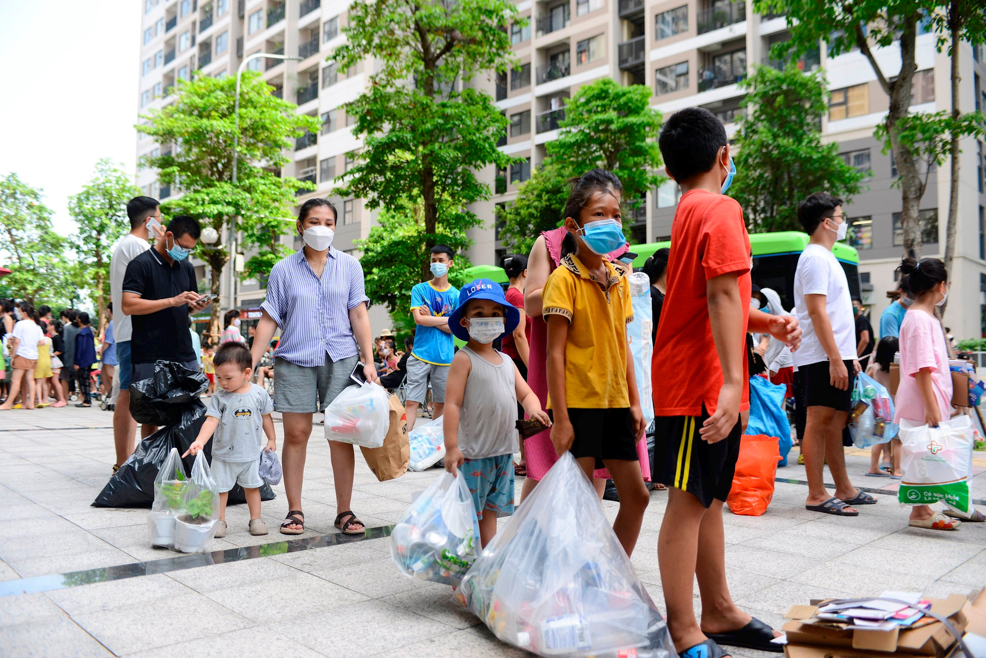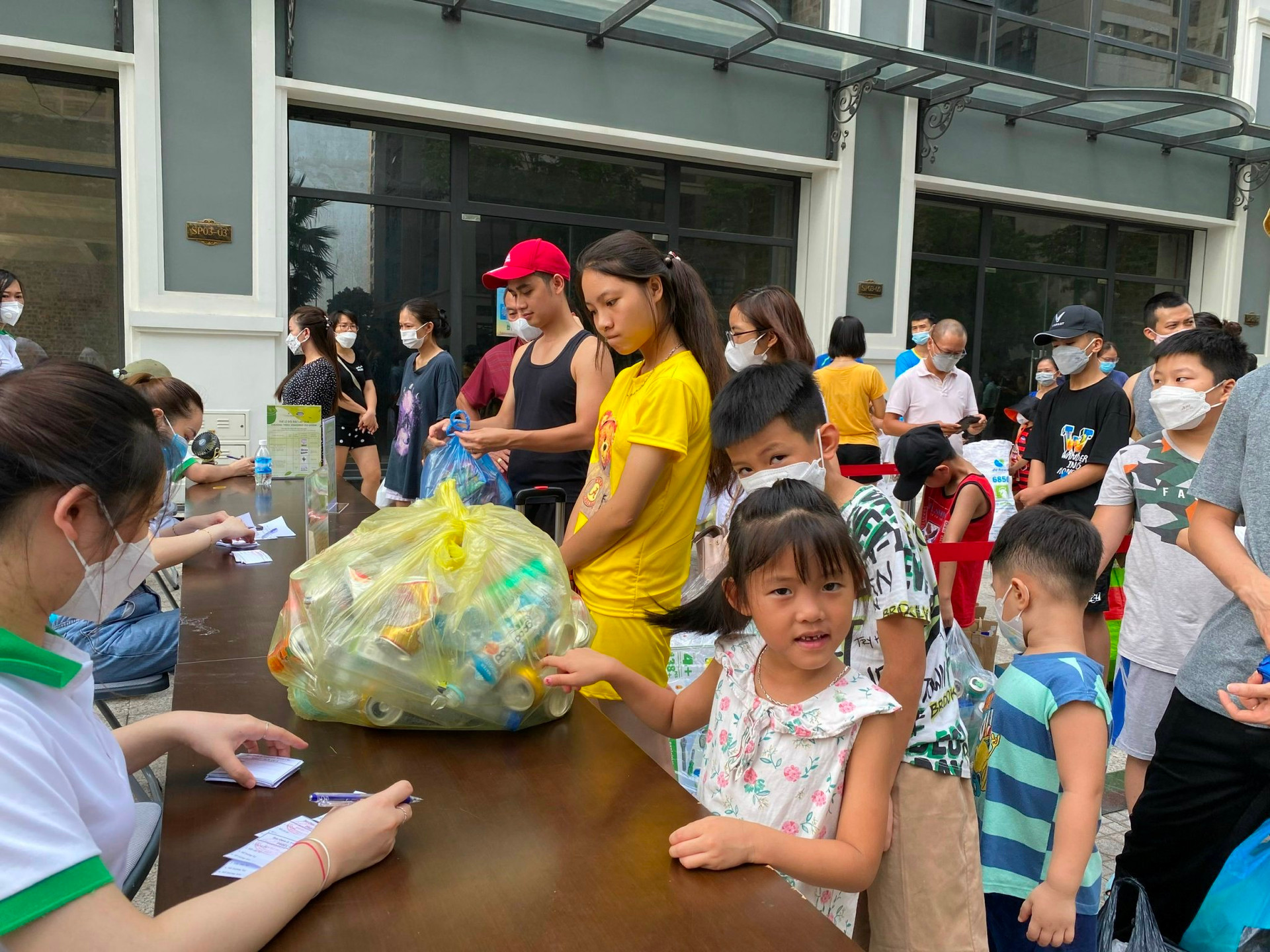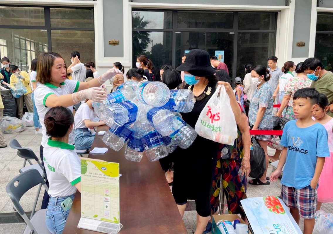 Từ sáng sớm người dân đã xếp hàng mang rác đến. Những người phụ trách của Vinhomes và Urenco có mặt từ rất sớm để làm công tác chuẩn bị