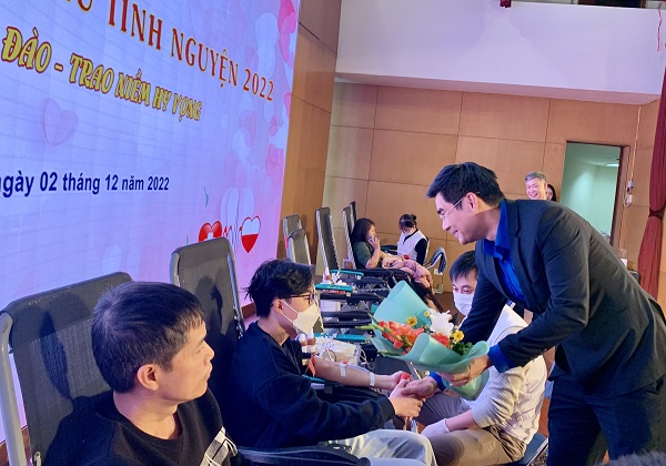 Đồng chí Hoàng Tiến Hưng- Bí thư Đoàn Tập đoàn Bưu chính Viễn thông Việt Nam tặng hoa cho ĐVTN, cán bộ công nhân viên trực tiếp hiến máu