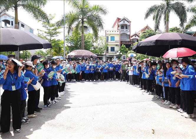 Thanh niên tình nguyện hỗ trợ thí sinh tại điểm thi Trường THPT Đan Phượng, huyện Đan Phượng, Hà Nội. Ảnh tư liệu: Hoàng Hiếu/TTXVN