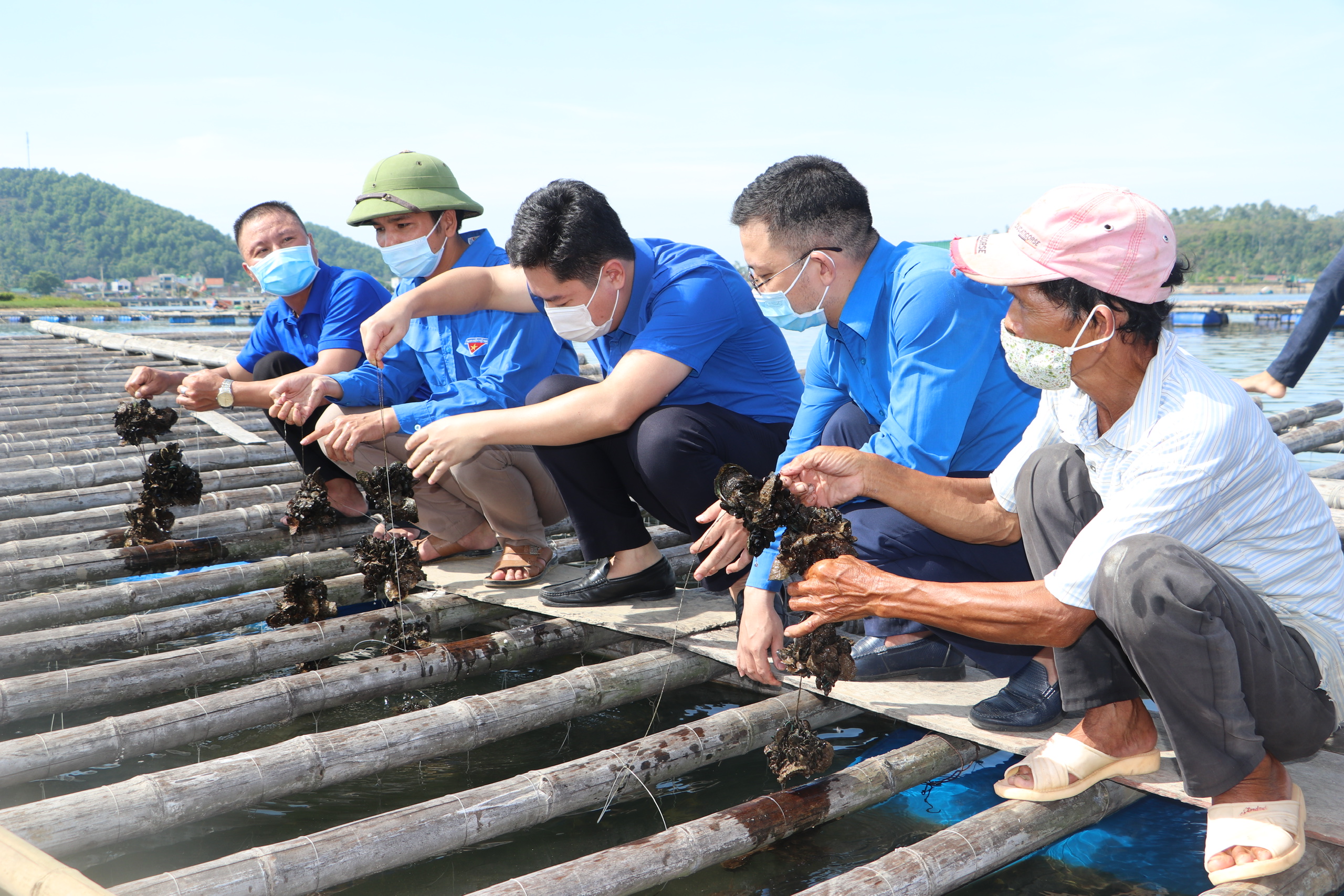 Đồng chí Lê Văn Lương - UVBCH Trung ương Đoàn, Bí thư Tỉnh đoàn đến thăm mô hình Nuôi hàu thương phẩm của anh Đậu Văn Thắng - Bí thư Đoàn xã Nghi Thiết, huyện Nghi Lộc