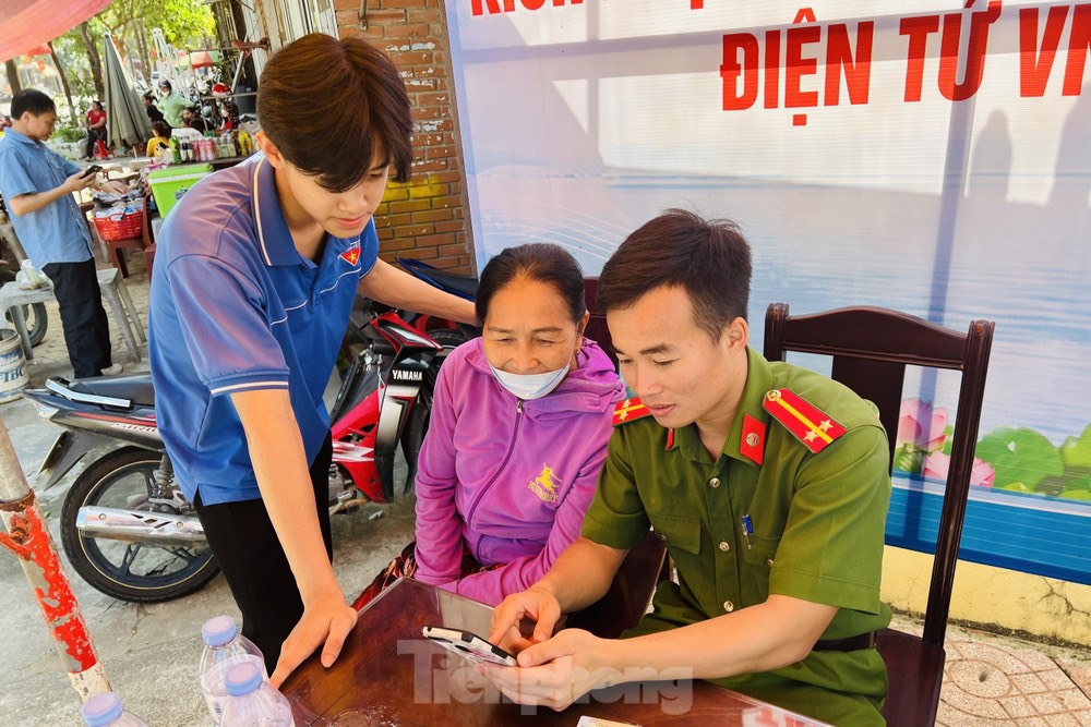 Người dân được cán bộ công an, đoàn viên thanh niên hướng dẫn cài đặt VNeID tận tình.