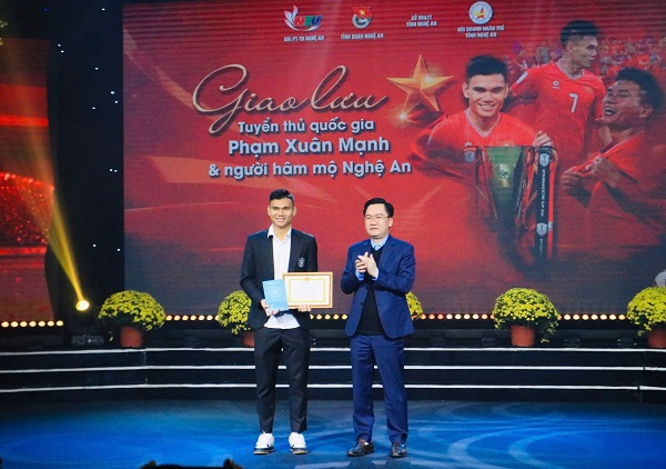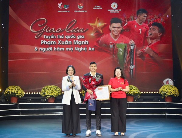 Nhân dịp này, Ủy ban Hội LHTN Việt Nam tỉnh Nghệ An đã tặng Bằng khen và Sở Văn hóa – Thể thao tỉnh Nghệ An tặng Giấy khen cho Phạm Xuân Mạnh - vận động viên Đội tuyển Bóng đá nam Quốc gia đã có thành tích thi đấu xuất sắc, giành Huy chương Vàng tại Giải vô địch Bóng đá Đông Nam Á.
