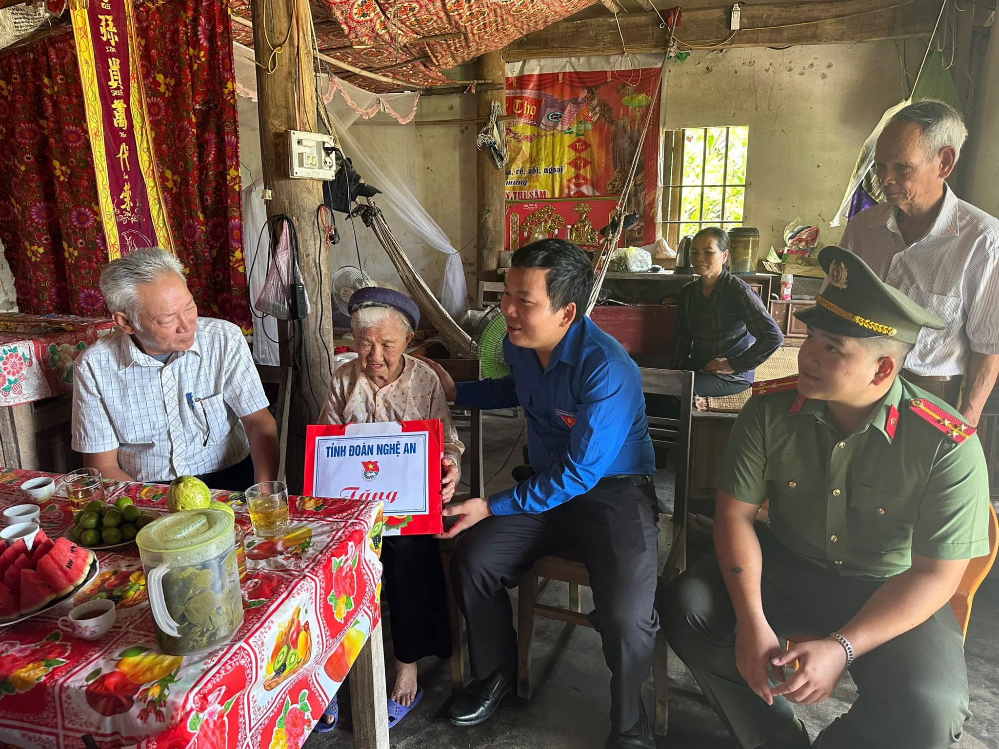 Tỉnh đoàn, đại diện tuổi trẻ Công an thị xã Hoàng Mai và lực lượng đoàn viên, thanh niên địa phương cũng đã có nhiều hoạt động tri ân các vợ, các mẹ liệt sĩ trên địa bàn thị xã. Ảnh: TĐNA