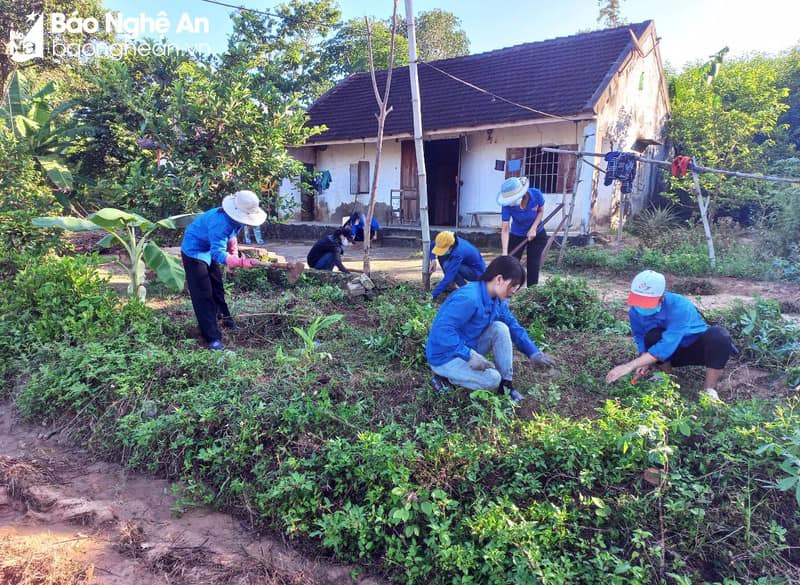 Tuổi trẻ địa phương chỉnh trang lại vườn nhà cho mẹ liệt sĩ Trần Thị Sâm. Ảnh: TĐNA